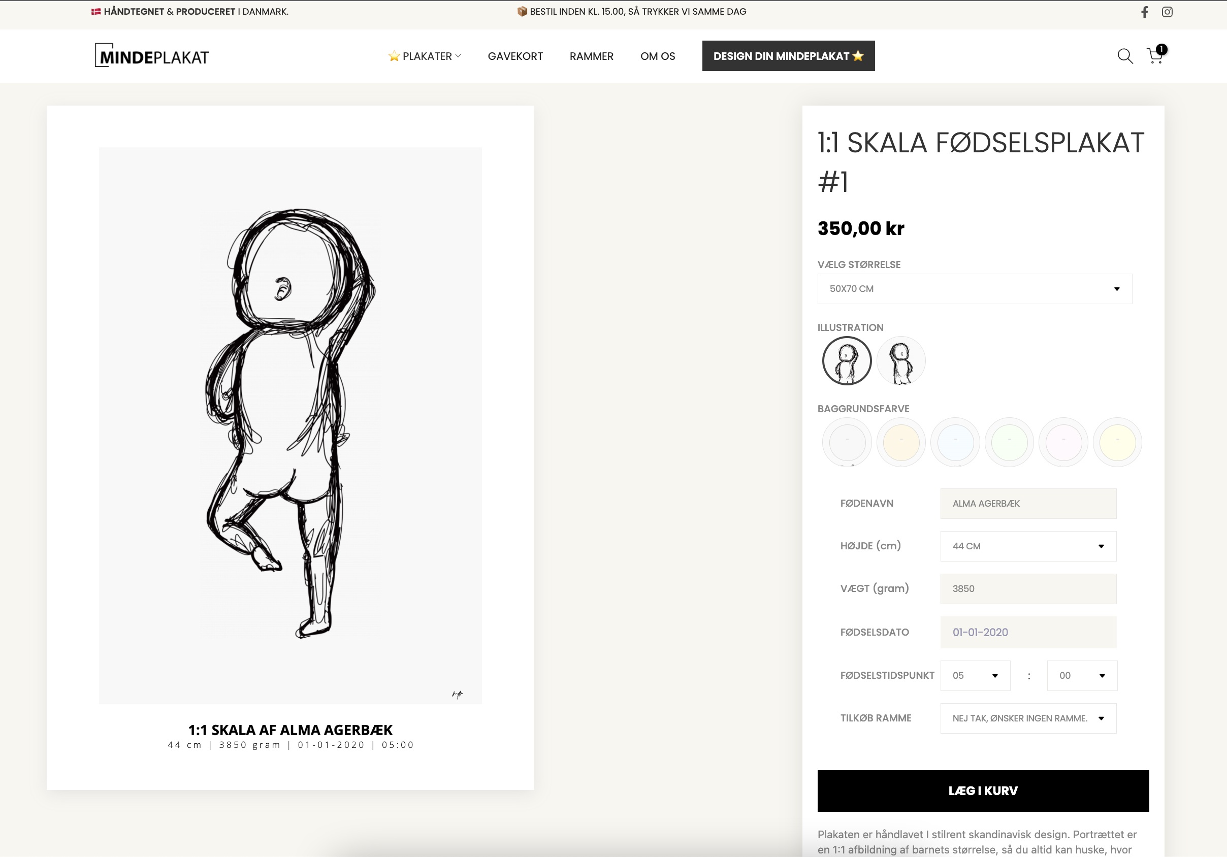 Her kan nævnes vores 1:1 skala fødselsplakat, som er en 1:1 illustration af konsumentens babys størrelse ved fødslen, og bliver printet med navn, højde, fødselsdato- og vægt. 1:1 fødselsplakaten. Altså kort fortalt; en unik plakat som foreviger det dejlige minde om, hvor lille babyen var ved fødslen.