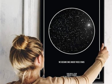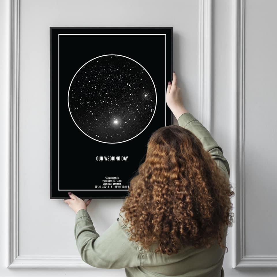 På en stjernehimmel plakat får vores kunder et helt præcist og unikt billede af hvordan stjernerne udfoldede sig på himlen netop på det tidspunkt, som har en helt speciel betydning i deres liv.