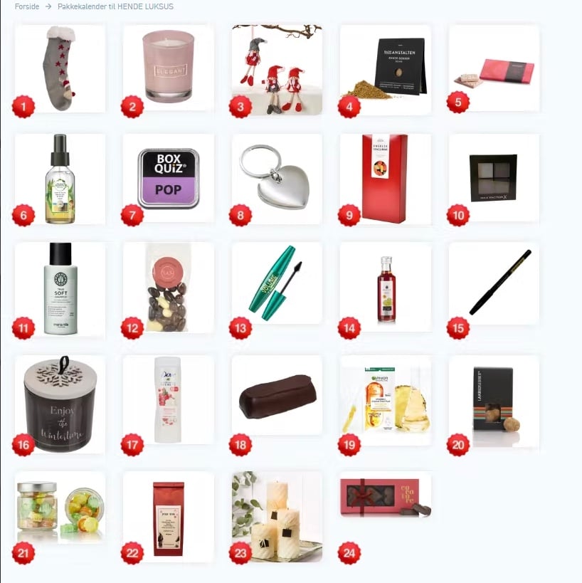 Vores kunder kan vælge mellem mere end 20 forskellige pakkekalendere, som vi har sammensat. Kunderne kan også købe kalender- og adventsgaver i styksalg.