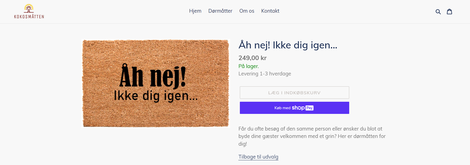 Produktet i sig selv er en stærk side. Der er ikke tale om flade Ali-Express måtter, men robuste 18mm tykke kokosmåtter med slidstærkt print, hvor kvaliteten tydelig ses ved første øjekast. Produktet er ydermere af en type og i et prisleje, hvormed den gør sig godt som gave; Indflyttergaver, julegave, fødselsdagsgave etc.