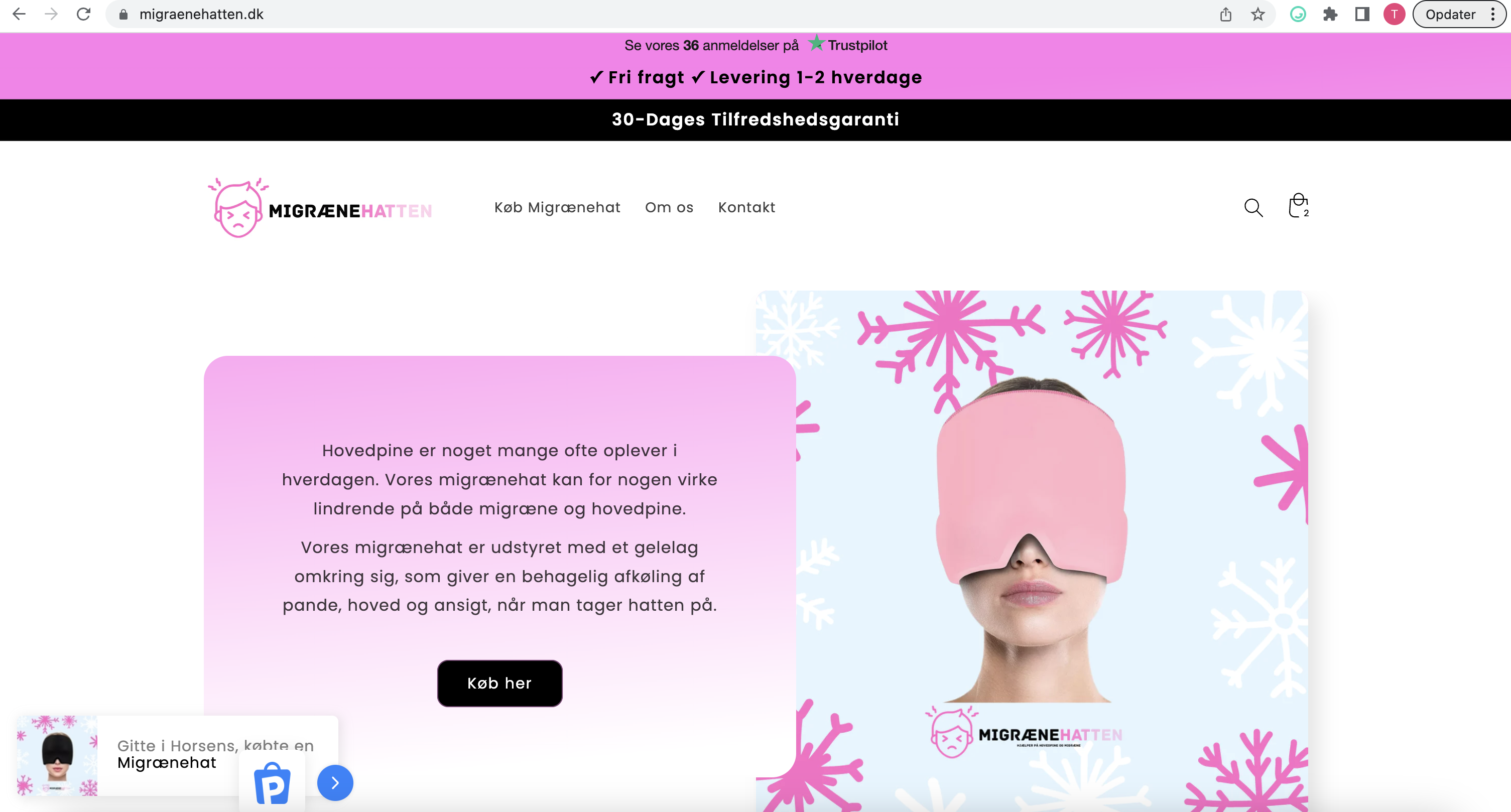 En af de største fordele ved vores webshop er dens stærke position inden for en niche, som har vist sig at have et stort potentiale for vækst. Der er stadig masser af muligheder for at øge omsætningen yderligere ved at udvide produktudvalget, implementere nye marketingstrategier og udvikle samarbejder med leverandører. Derudover er vi de eneste lige pt. som er forhandler af dette produkt, samtidig med vores domæne er perfekt til produktet. Vi ligger også nr. 1 på Google, indenfor de fleste søgninger der har noget med "hovedpine hat" "migræne hat" "migrænehat" "migrænehatten" "migrænehue".