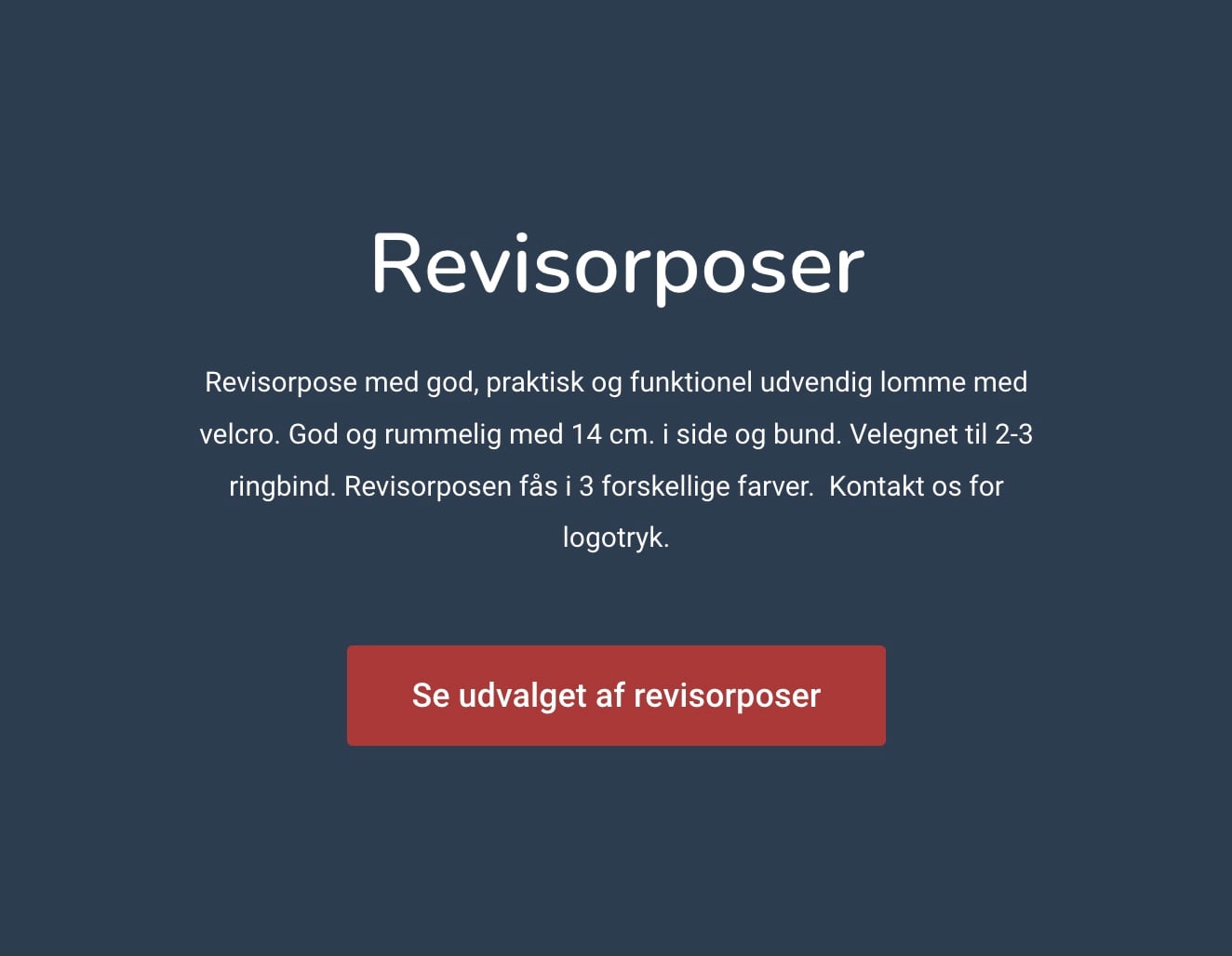 Revisorposen.dk sælger tekstilposer med tryk af logo, som revisorposer, kanvas- og muleposer til erhvervsvirksomheder, der ønsker at markedsfører sig i det offentlige rum med disse... Via sidens formular udfylder kunden hurtigt og nemt behovet og fortæller, hvilken pose, der er interesse for og beder om enten en mail eller opringning med tilbud fra Revisorposen.