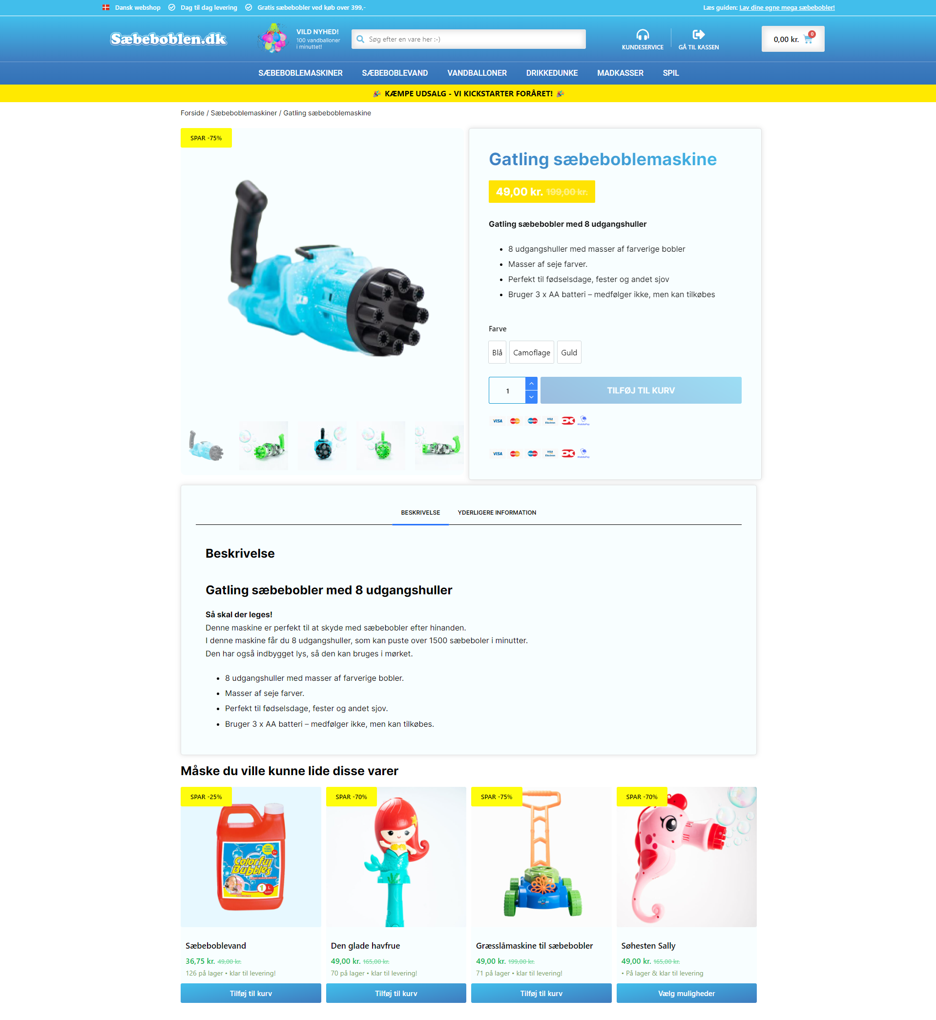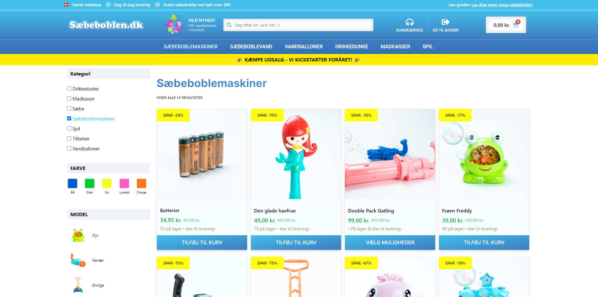 Er du en iværksætter med en passion for sjove og unikke sommerlegetøj? Så er Sæbeboblen.dk den perfekte webshop for dig! Med en bred vifte af farverige og sjove produkter til børn og voksne er Sæbeboblen.dk den ultimative destination for alle, der ønsker at have det sjovt i solen. Fra sæbeboblemaskiner til vandlegetøj til strandspil, tilbyder Sæbeboblen.dk noget for enhver smag og aldersgruppe. Med fede produkter og flot website, giver sæbeboblen dig et godt udgangspunkt for at få succes henover sommeren.
