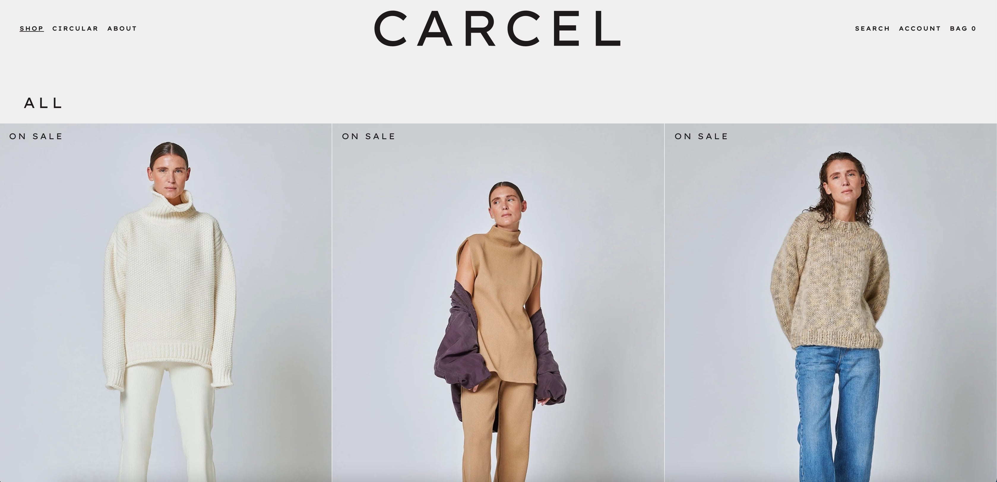 Carcel er fokuseret ( for nærværende ) omkring womens fashion i kategorierne strik, silk, sweat/jersey med en unik tilgang til produktionen. Der ud over er der indbygget cirkularitet og formålsbaserede initiativer i forretningsmodellen. pt er det en DtC model, men tidligere har BtB også været en del af forretningsmodellen