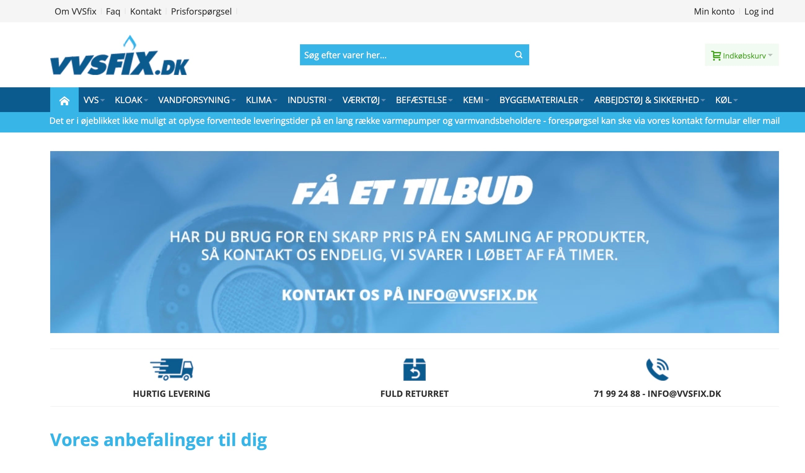 Stabil webshop med salg af produkter inden for VVS, klima, byggematerialer, værktøj osv. Vi samarbejder med alle de store grossister i DK og har et produktsortiment på mere end 500.000 varer. Alle lagervarer kan stort set leveres fra dag til dag.