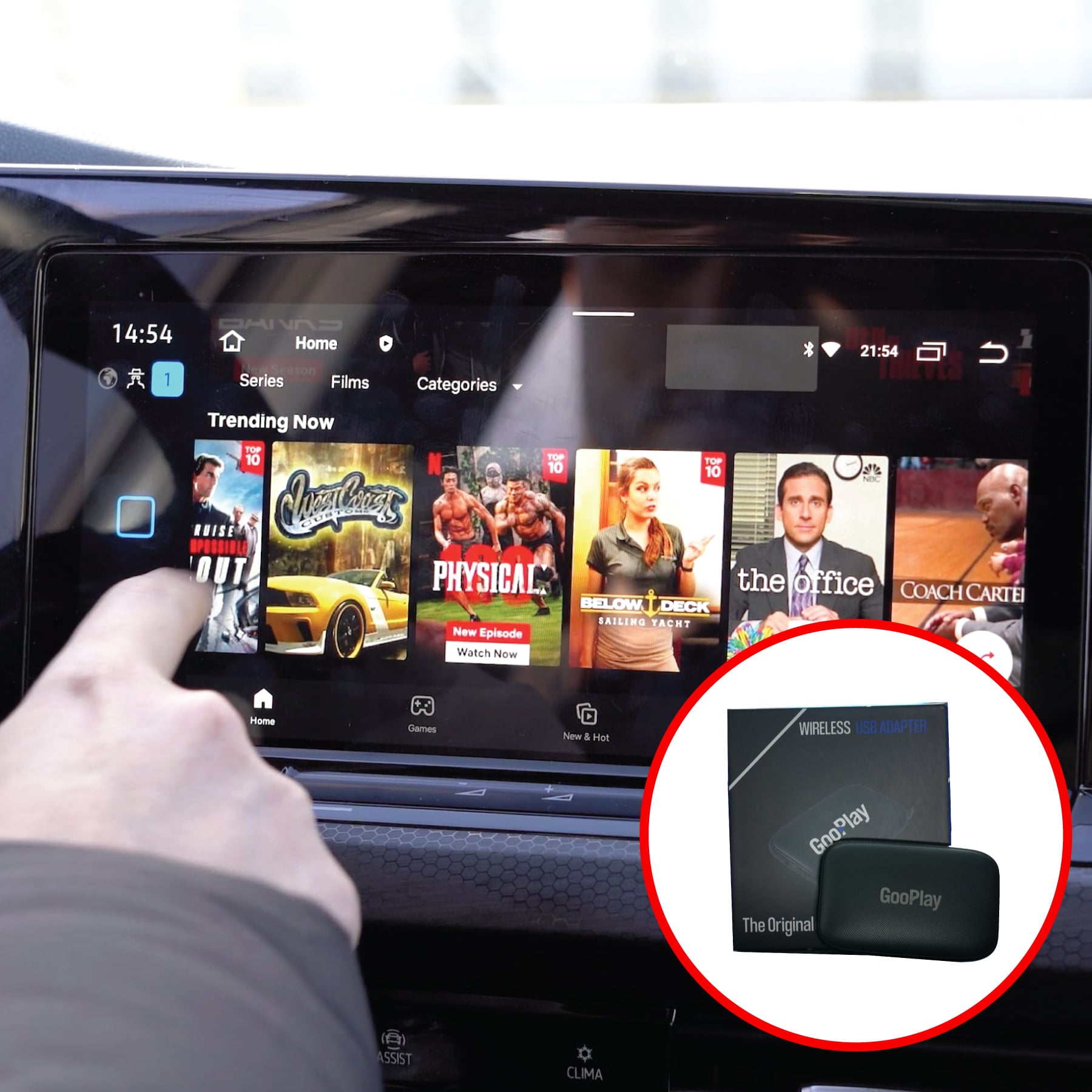 GooPlay sælger innovative produkter til bil branchen. Her er vores best-seller en adapter til bilen, der giver dig trådløs Apple CarPlay samt muligheden for at se youtube og netflix på din bil skærm.