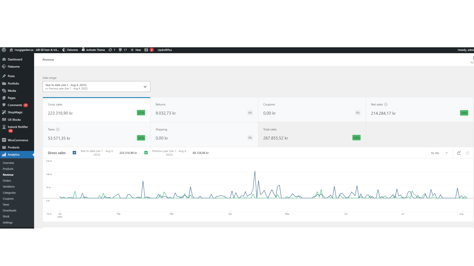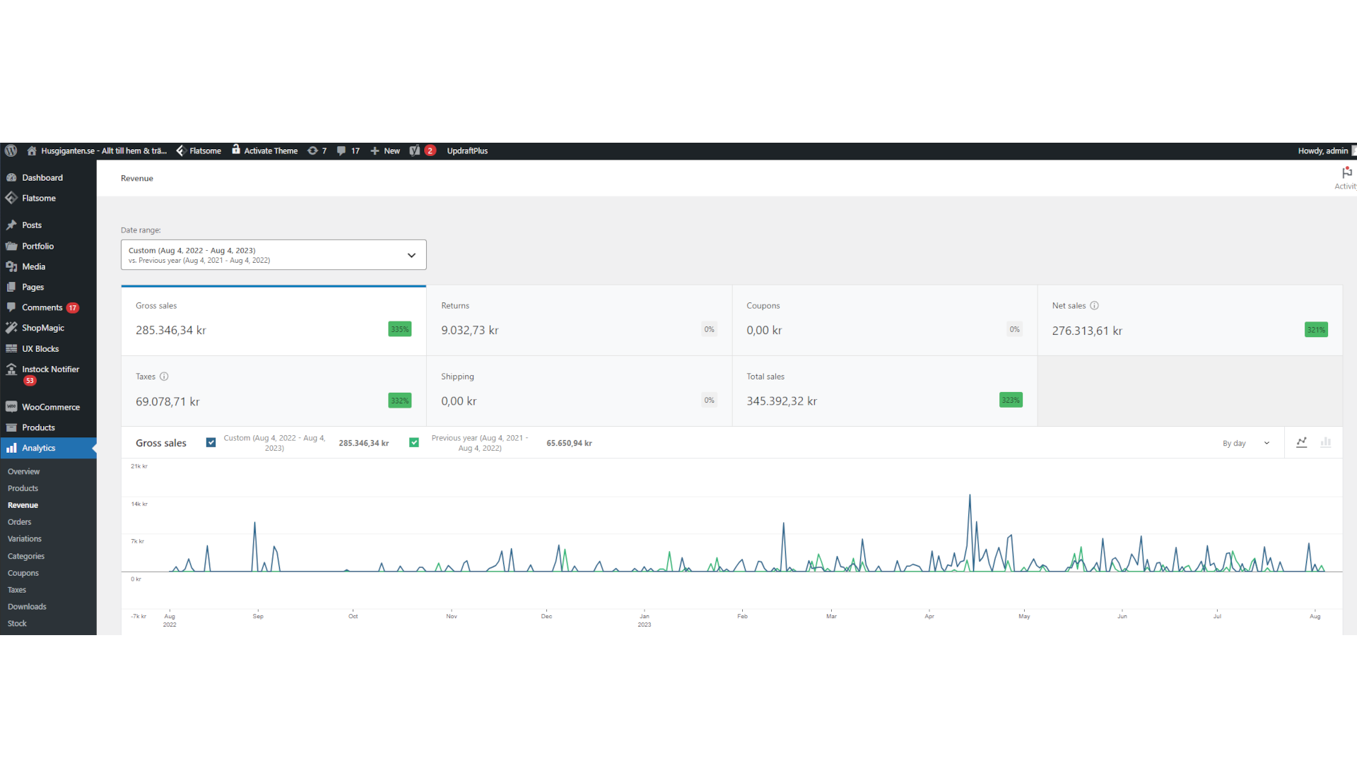 - Betalingskortsindløsergebyr Klarna ca. 3,5% (Anbefaler at du skifter til danske Quickpay/Clearhaus der koster 2,5%) dvs. de sidste 12 måneder (4/8-2022-4/8-2023) har der været betalingsgebyrer for 7.701,- DKK (da gebyrene beregnes udfra omsætningen inkl. 25% svensk moms)