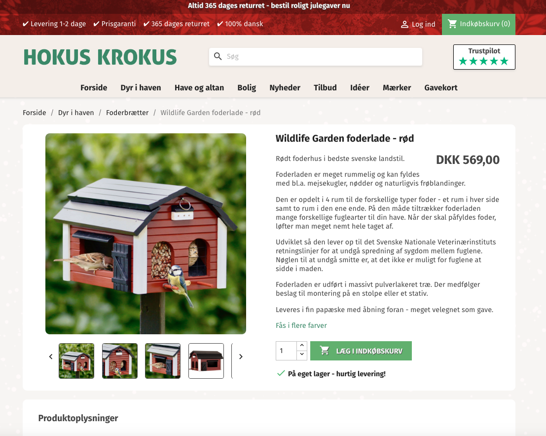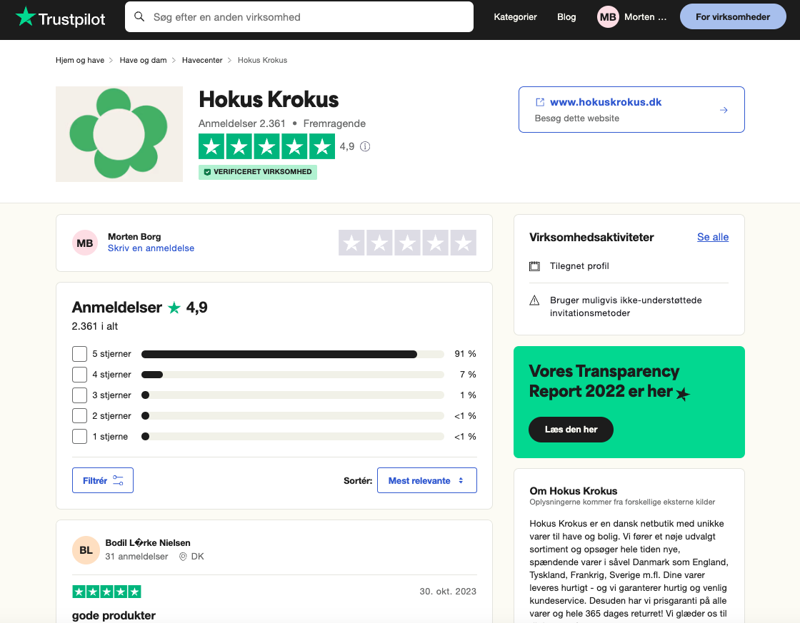 Hokus Krokus - www.hokuskrokus.dk - er en webshop startet i 2014 med fokus på haveartikler, men siden mere og mere bolig. Det primære salg er i Danmark, men fra primo 2023 også salg i Tyskland, Sverige og Holland på tilhørende .de, .se og .nl domæner - domæner til yderligere lande ejes. Der er god vækst i salg til Sverige og Tyskland. Lageret håndteres fuldautomatisk af DSV i Kolding (flyttes til Horsens 2024) - så 100% styr på logistik og nem at overtage. Der er 40.000 modtagere af nyhedsbrev. I den daglige drift er kun 1 person, da lageret håndteres eksternt, og jeg ønsker at prøve nye ting. Er også åben for salg hvor jeg helt eller delvist fortsætter. Let omsætteligt varelager på 800.000 (ikke inklusiv i pris).
