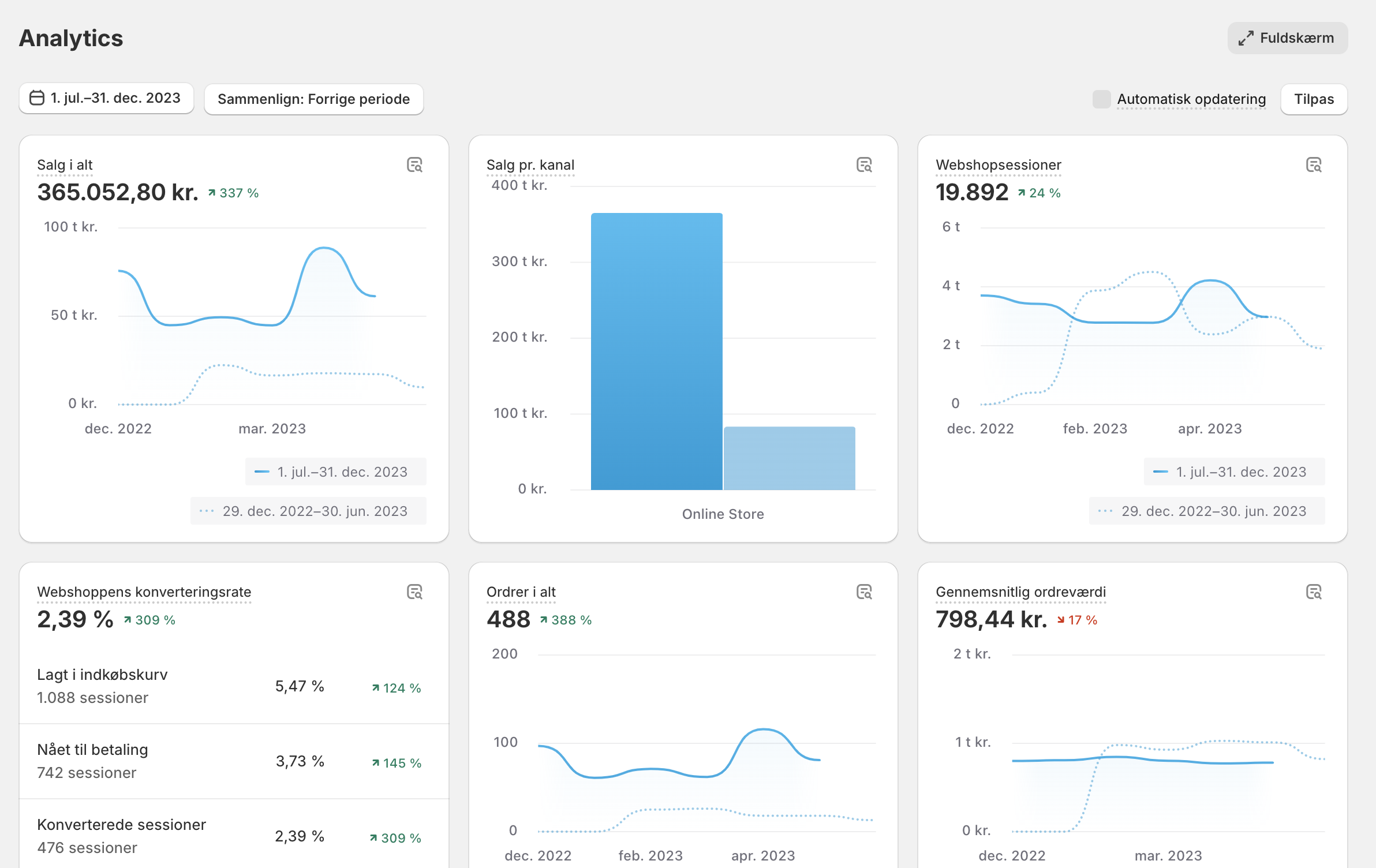 Der har de seneste 6 måneder været 19.600 besøgende på shoppen. Den gennemsnitlige ordreværdi er på 770 kr. og shoppen har konveteringsrate på 2,39 %. Største delen af shoppen salg kommer gennem Annoncering på SoMe og Google samt affiliate.