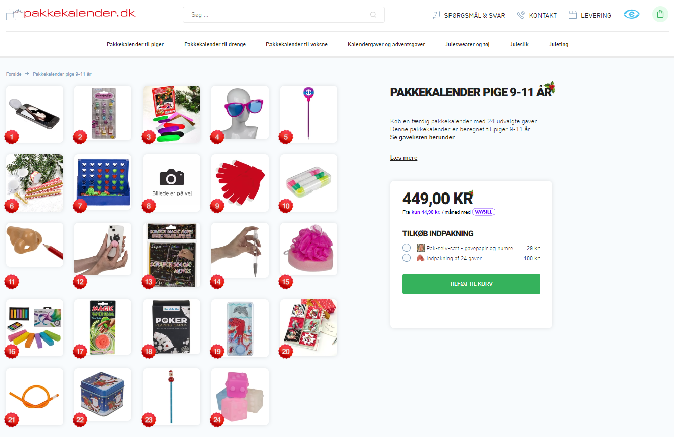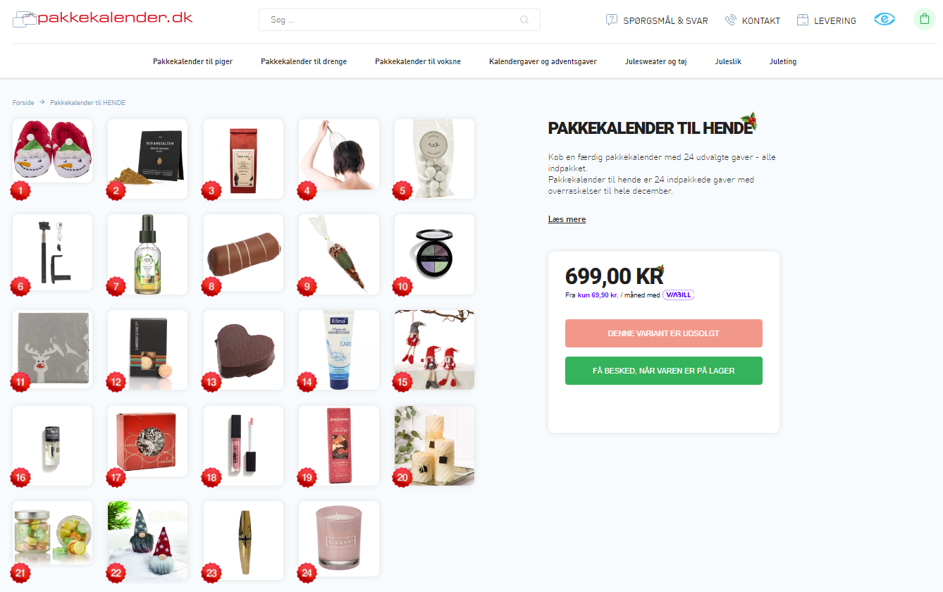 Vores kunder kan vælge mellem mere end 20 forskellige pakkekalendere, som vi har sammensat. Kunderne kan også købe kalender- og adventsgaver i styksalg.