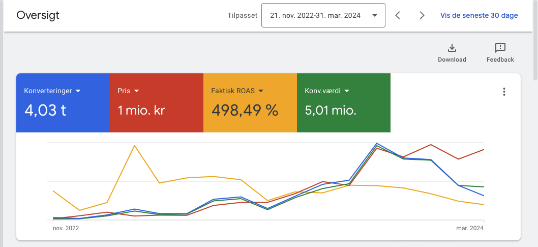 Blended ROAS fra november 2022 - marts 2024 = 4,281%