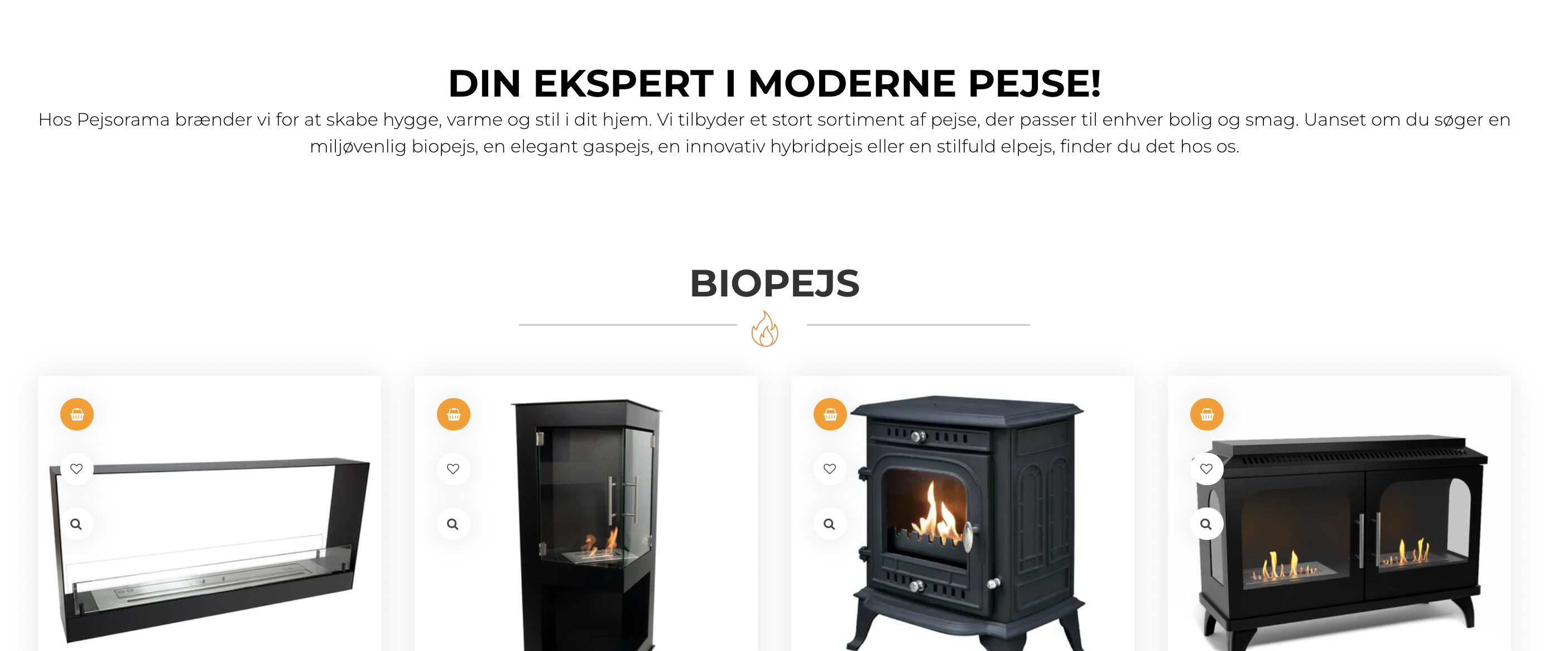 Pejsorama er en specialiseret webshop, der tilbyder et bredt udvalg af moderne pejse – fra biopejse og gaspejse til hybrid-, el- og udendørspejse. Vores produkter imødekommer kundernes behov for æstetisk og funktionel opvarmning, der samtidig skaber hygge og en indbydende atmosfære i hjemmet. Med fleksible leveringsløsninger og et sortiment, der spænder over forskellige stilarter, hjælper vi vores kunder med at finde den perfekte pejs til netop deres bolig og indretningsstil.