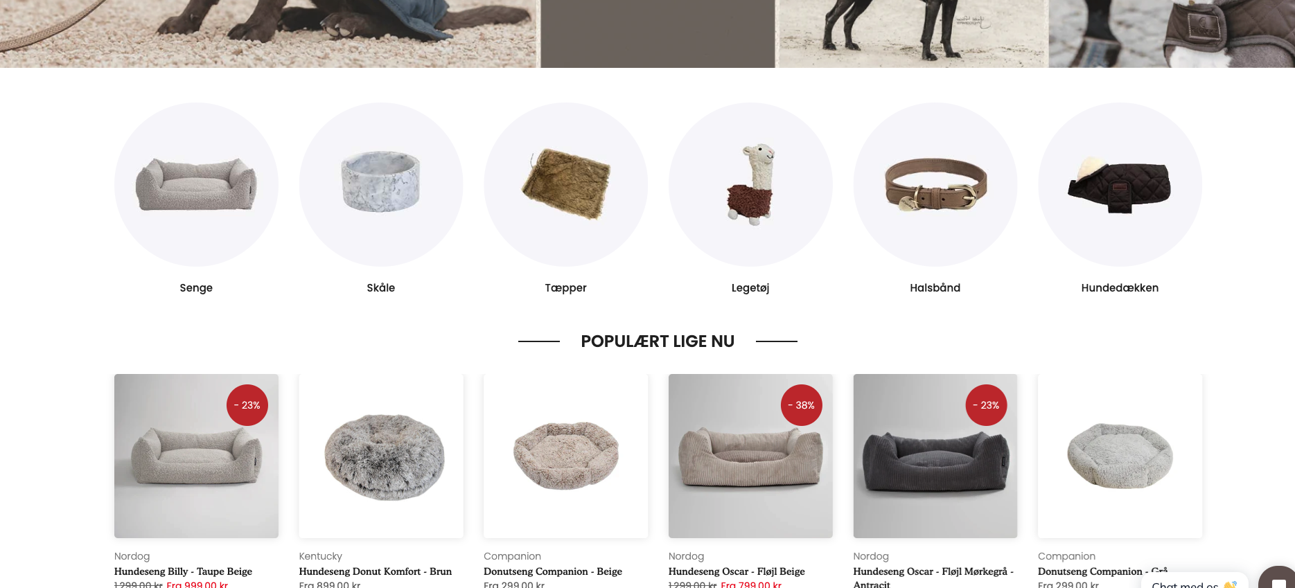Hundesenge, hundeskåle, hundeseler, hundedækkener fra top brands, såsom Nordog, Trixie og Kentucky.