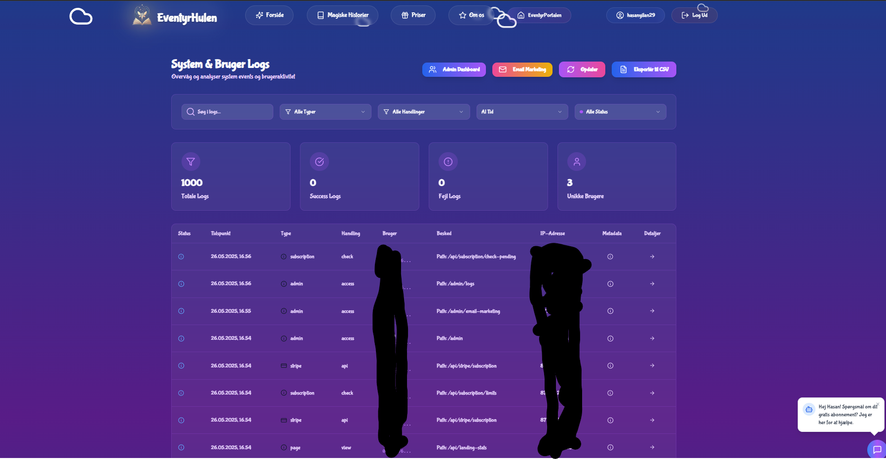 • Detaljeret systemlog: 1000+ logged aktiviteter og brugerhandlinger