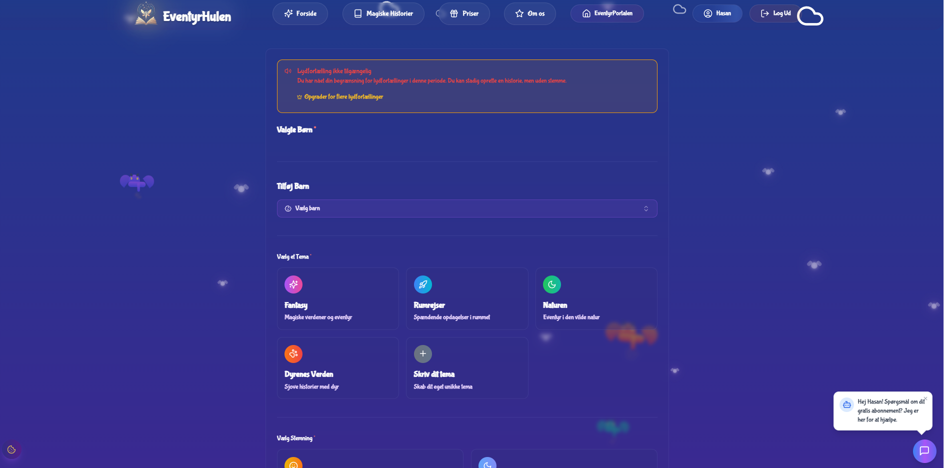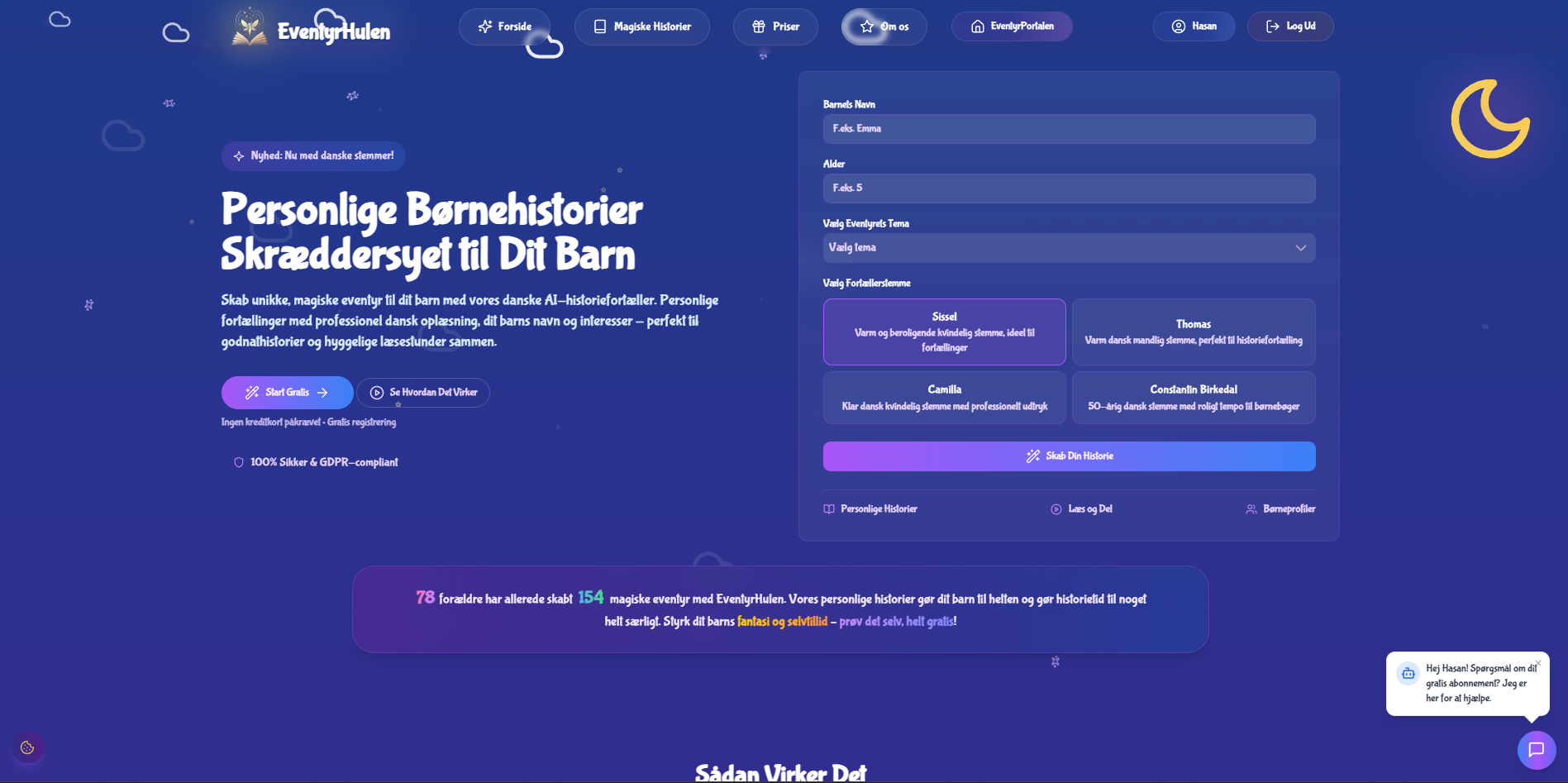 Eventyrhulen er en færdigudviklet, abonnementsbaseret SaaS-platform, hvor børn og forældre skaber unikke, personaliserede eventyr på sekunder. Brugeren vælger tema, barnets alder og interesser – AI'en genererer magiske historier med dansk voice-over, animeret bog-visning og farvelægningsbilleder. Alt er kodet og klar til brug med 100% automatiseret drift.