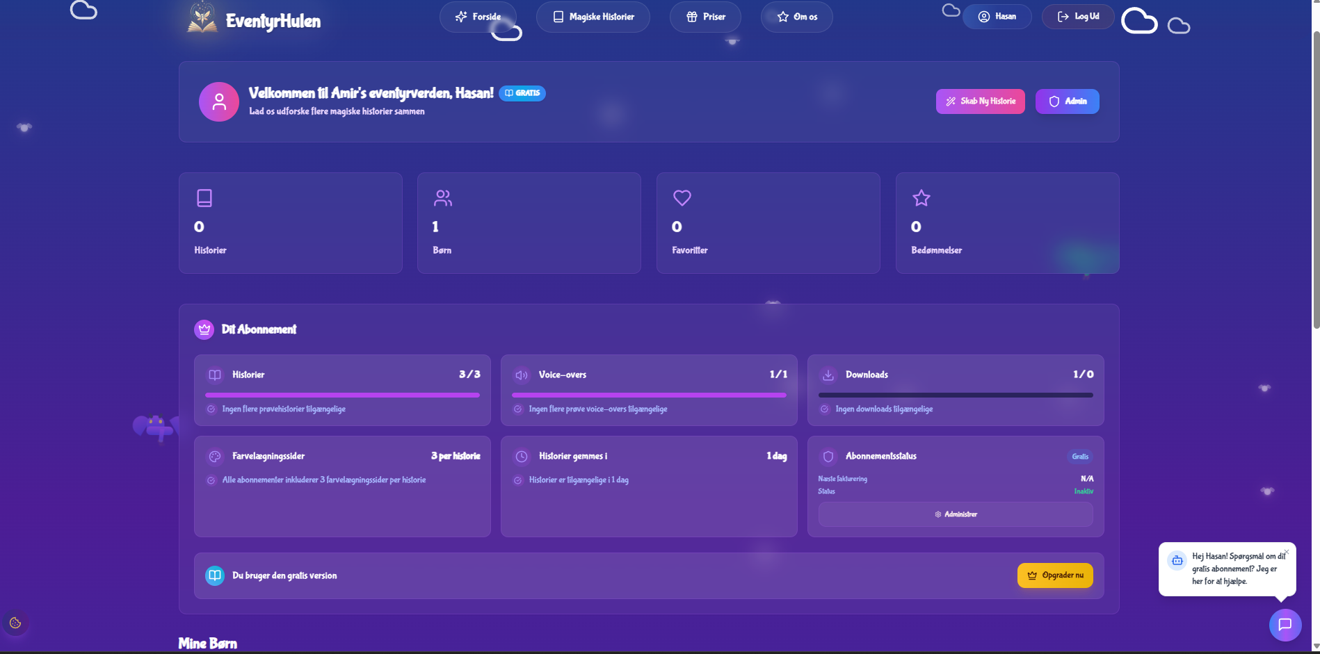 Eventyrhulen er en AI-baseret platform til personlige børnehistorier, hvor brugeren opretter børneprofil og får genereret unikke eventyr med dansk voice-over på under 10 sekunder. Løsningen er bygget som en komplet SaaS-forretning med admin panel og 100% automatiseret drift - ingen ansatte eller manuel support påkrævet.