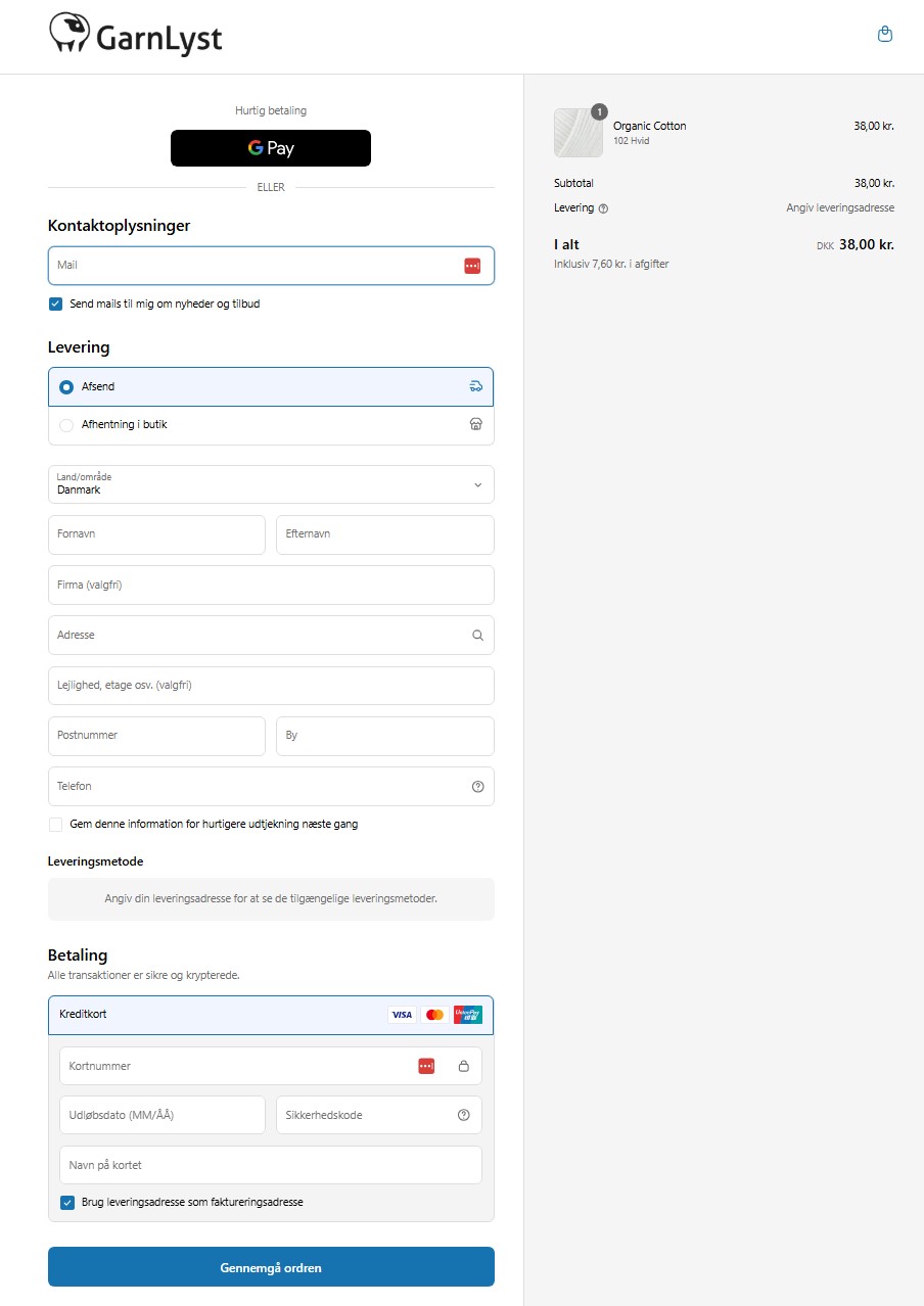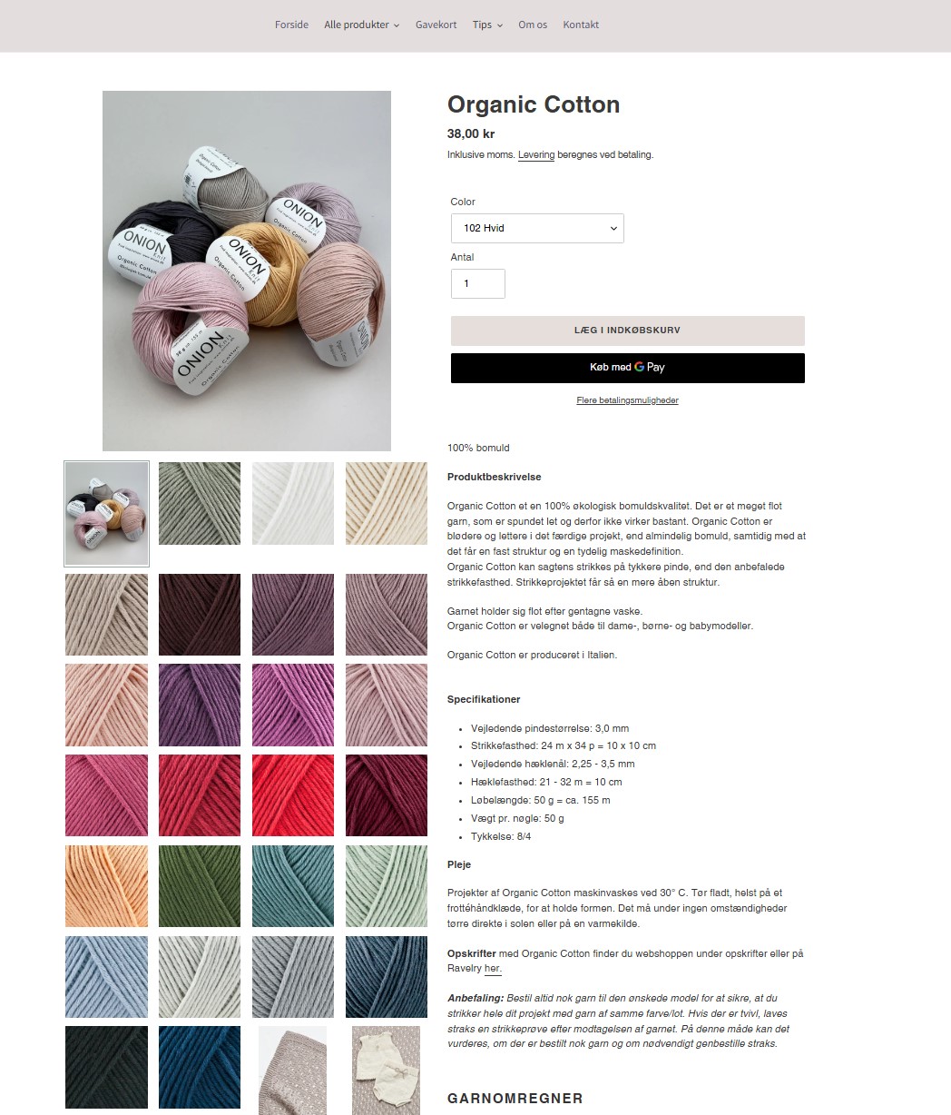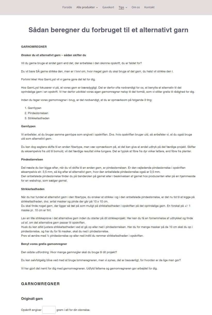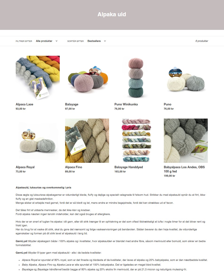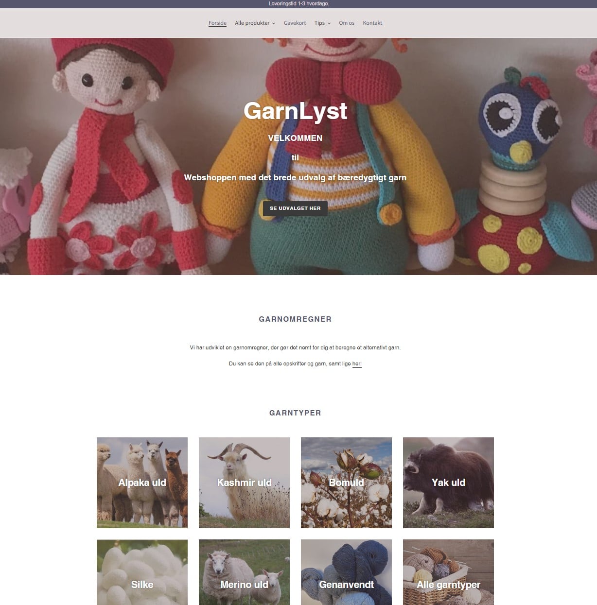 GarnLyst sælger garn, strikketilbehør og opskrifter gennem en moderne Shopify-webshop.