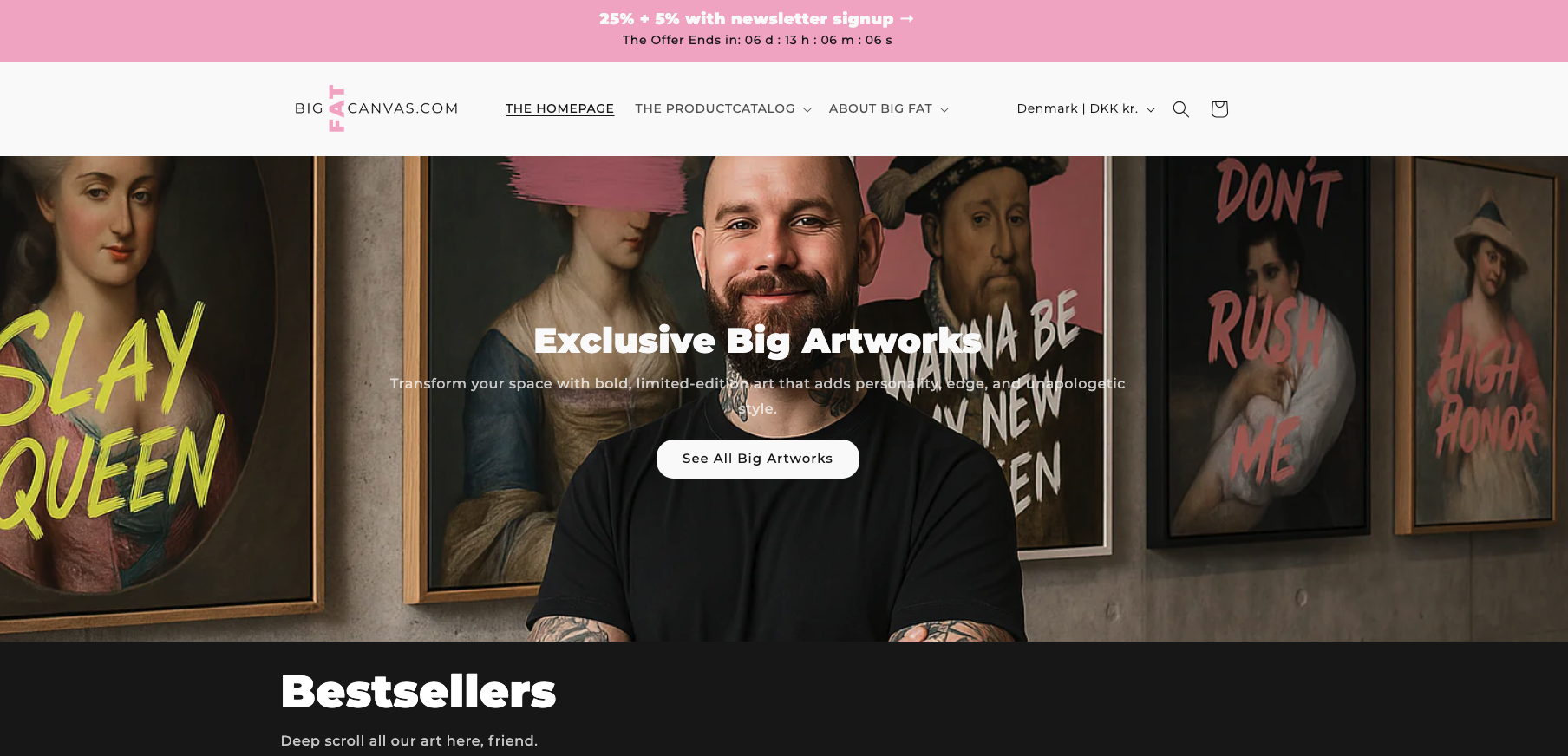 BigFatCanvas.com er en nybygget webshop med et stilrent og letgenkendeligt brand – specialiseret i canvas print-on-demand. Den er allerede fuldt sat op med dropshipping-partneren Printumo.com, hvilket betyder:
