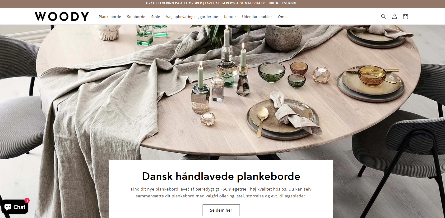 Woody Design – Webshop med plankeborde og bæredygtige designmøbler (dropshipping, ingen lager)