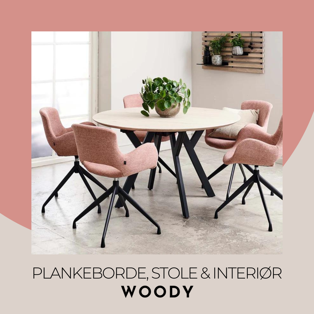 Woody Design tilbyder smukke massive egetræsplankeborde, både i standardmål og specialmål, forskellige olieringer/farver og stel. Kunderne kan selv vælge og få deres helt eget unikke bord. Webshoppen har også stole, havemøbler, vægopbevaring, kontormøbler og garderobemøbler. Hovedparten af produkterne er dansk produceret og af bæredygtigt FSC certificeret træ - og for hvert plankebord der sælges, plantes et nyt træ (i samarbejde med Klimatræ).