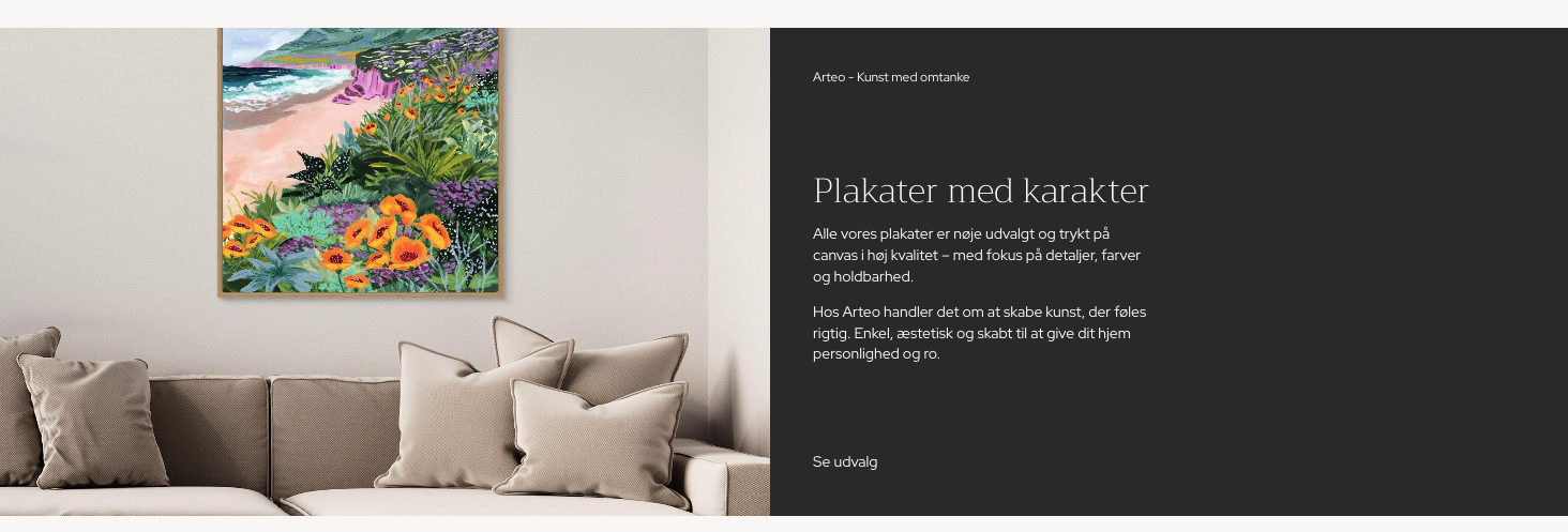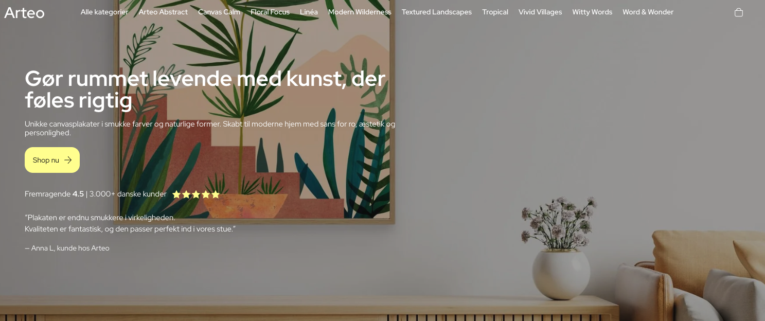 Arteo.dk er en nybygget og fuldt opsat Shopify-webshop, skabt til at sælge canvas-plakater gennem et stilrent og letgenkendeligt brandunivers. Alt er sat op og klar – fra design og funktionalitet til leverandørintegration og produktudvalg – så du kan komme i gang med det samme, uden at skulle håndtere lager, produktion eller logistik.