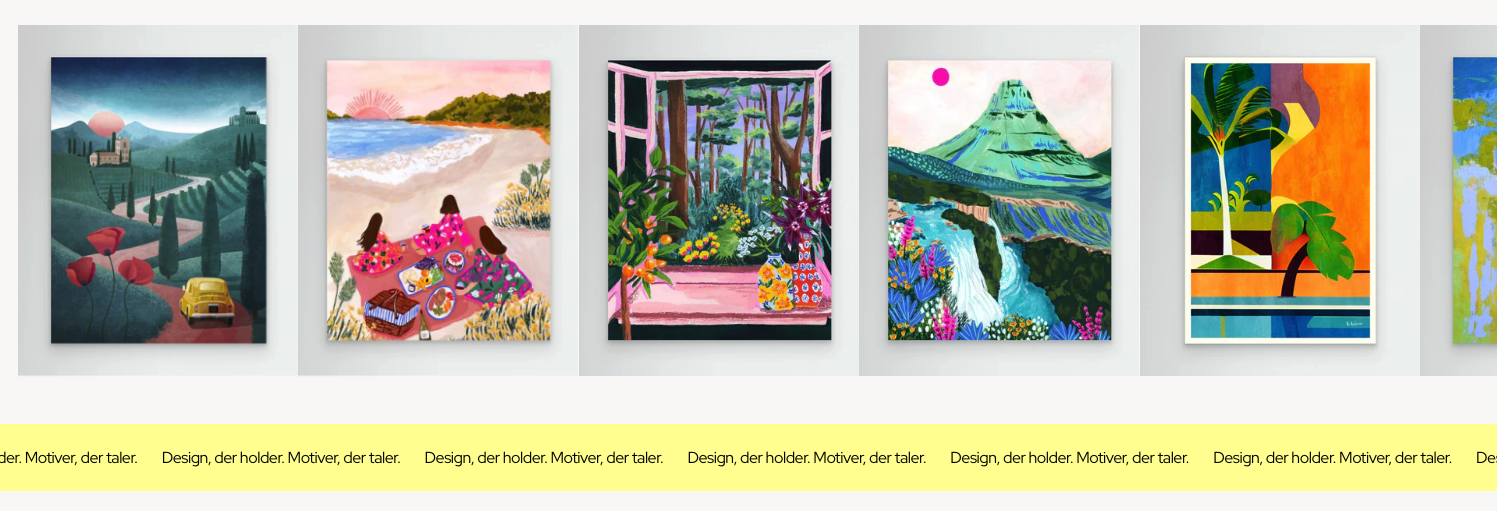 Der er allerede tilføjet over 200 unikke plakater fordelt på forskellige kategorier, men det er nemt at udvide sortimentet via leverandørens platform, hvor du har adgang til over 100.000 kunstværker fra deres licenserede art-library. Med få klik kan du løbende tilføje nye motiver, og alle kunstnere får automatisk royalties ved hvert salg, så du samtidig støtter den kreative branche.