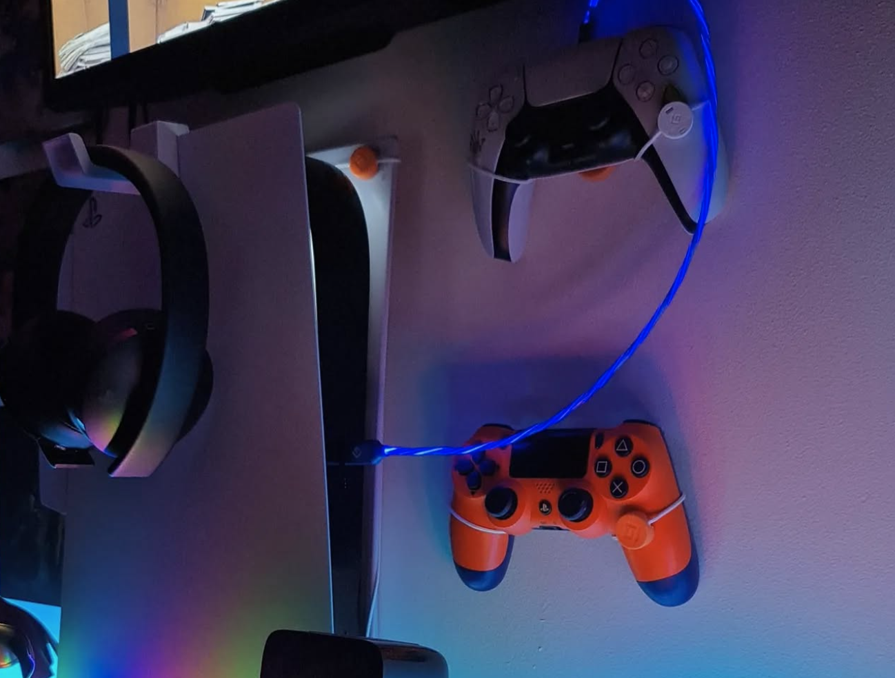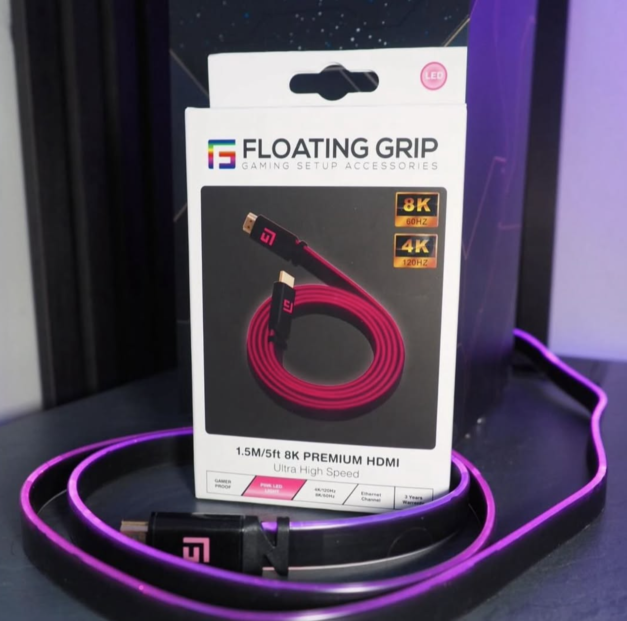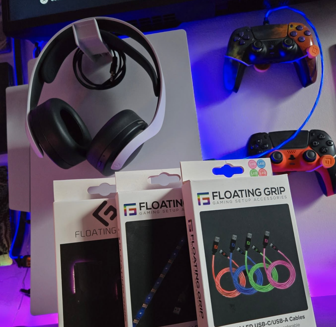 FLOATING GRIP består af vægbeslag til spilkonsoller, LED-belysning og HDMI-kabler med LED lys.