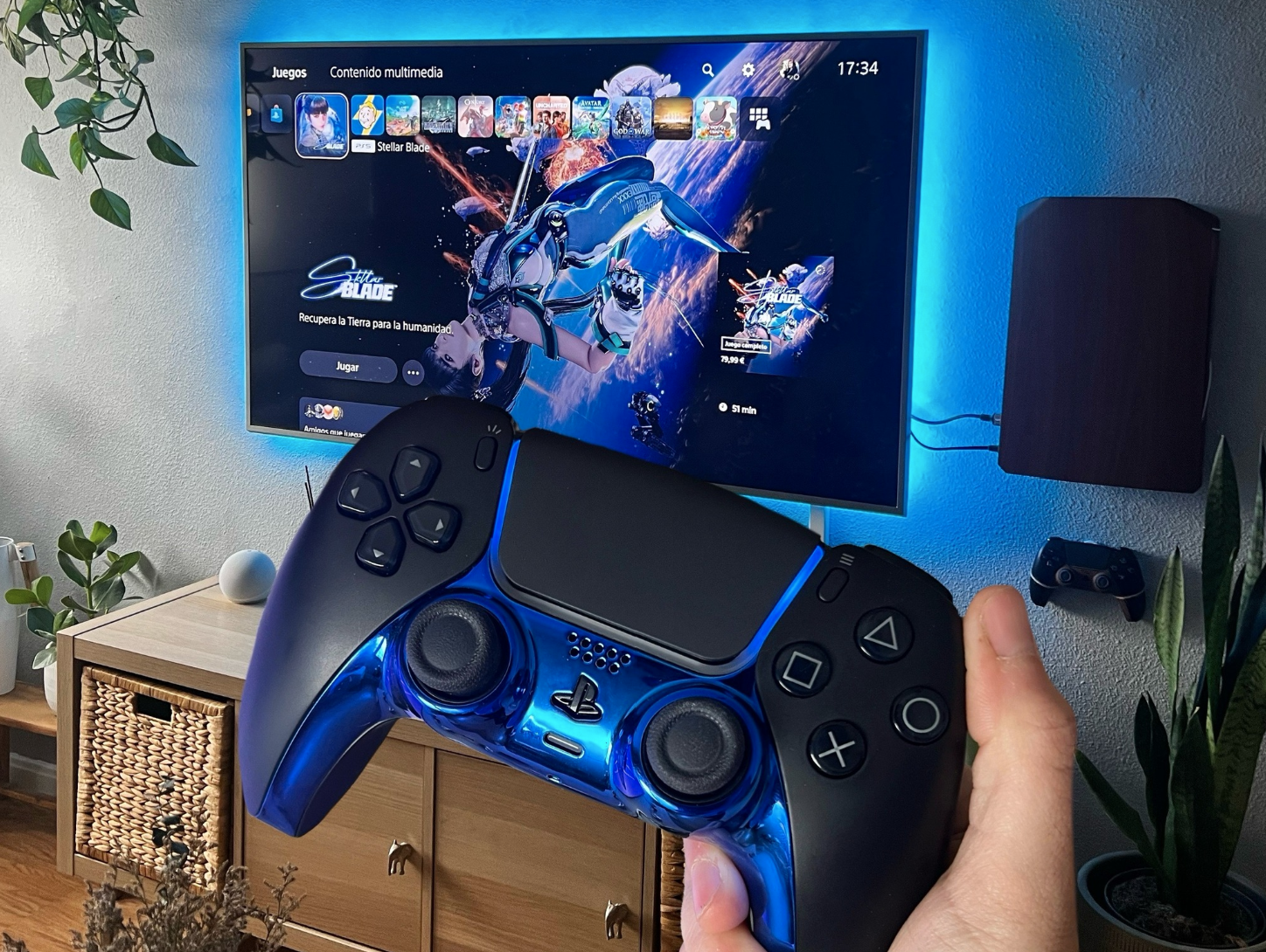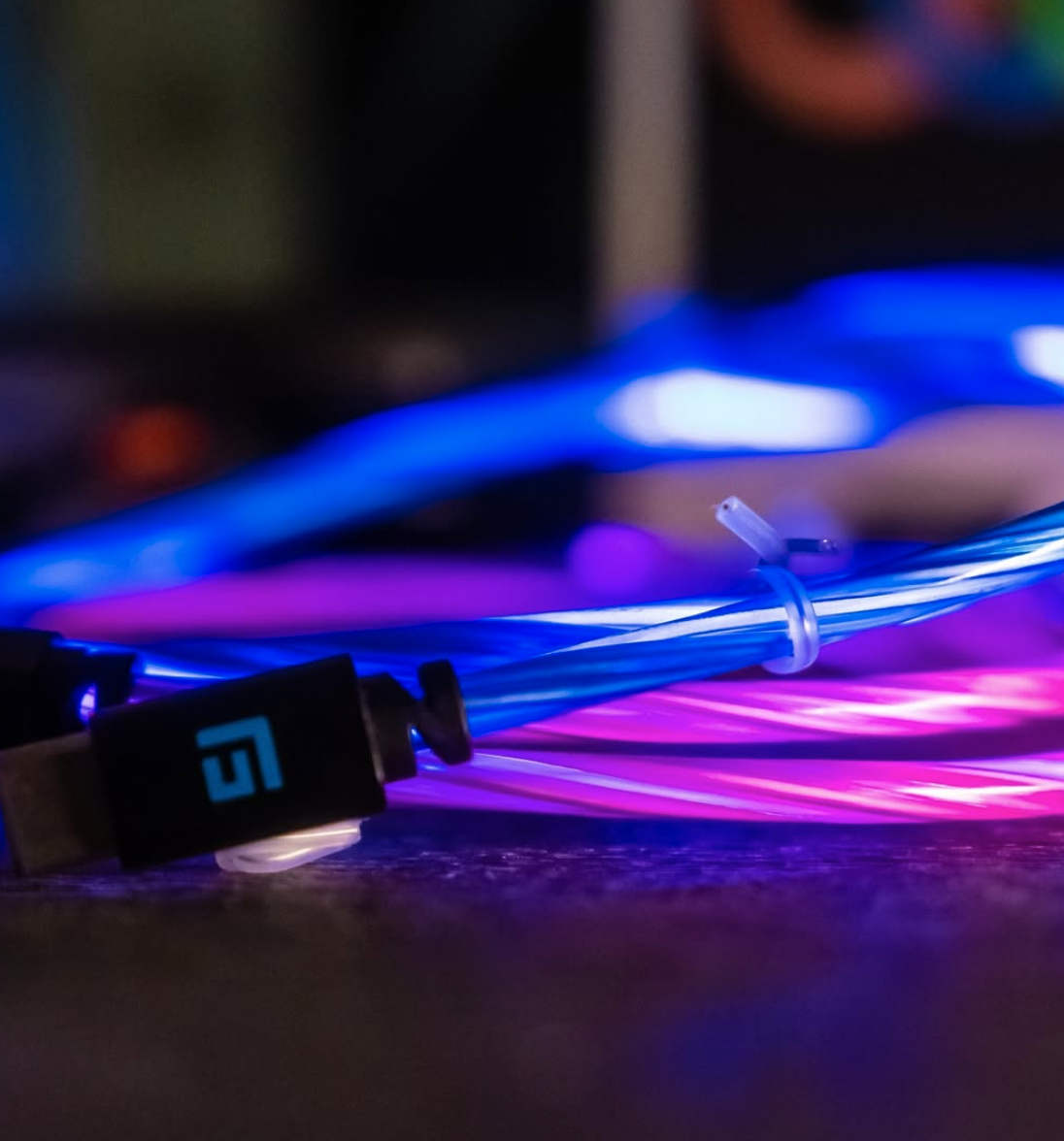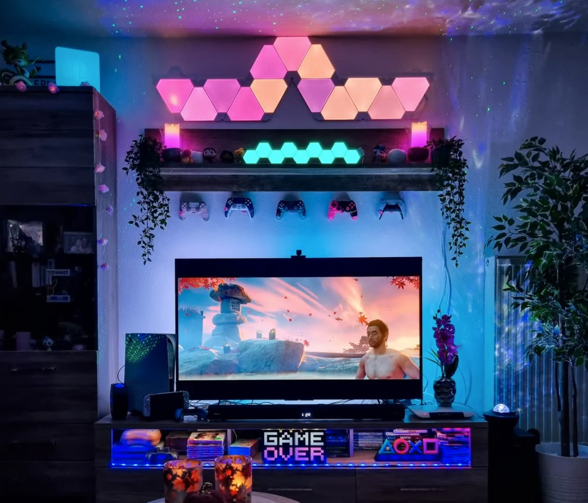 FLOATING GRIP består af vægbeslag til spilkonsoller, LED-belysning og HDMI-kabler med LED lys.