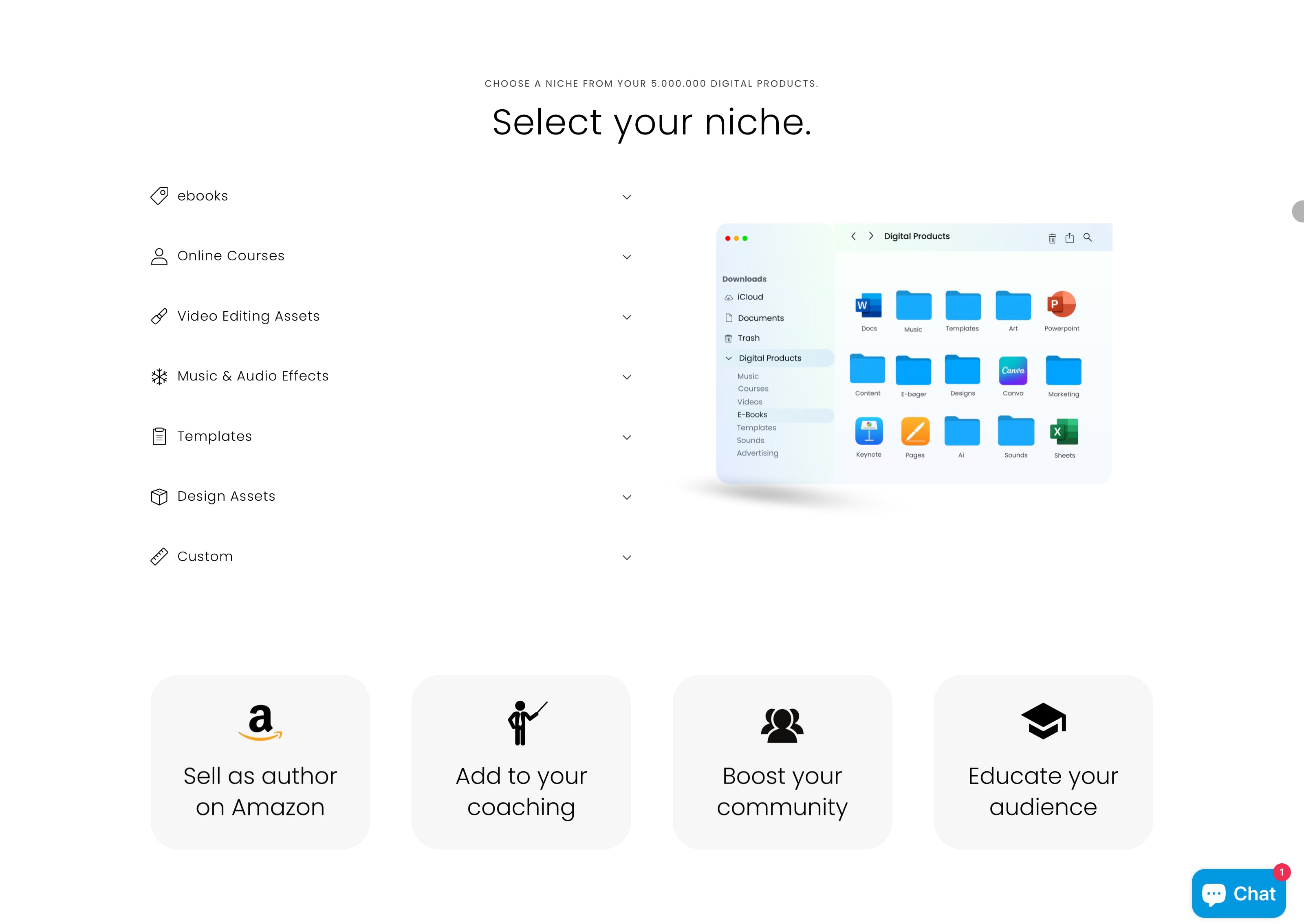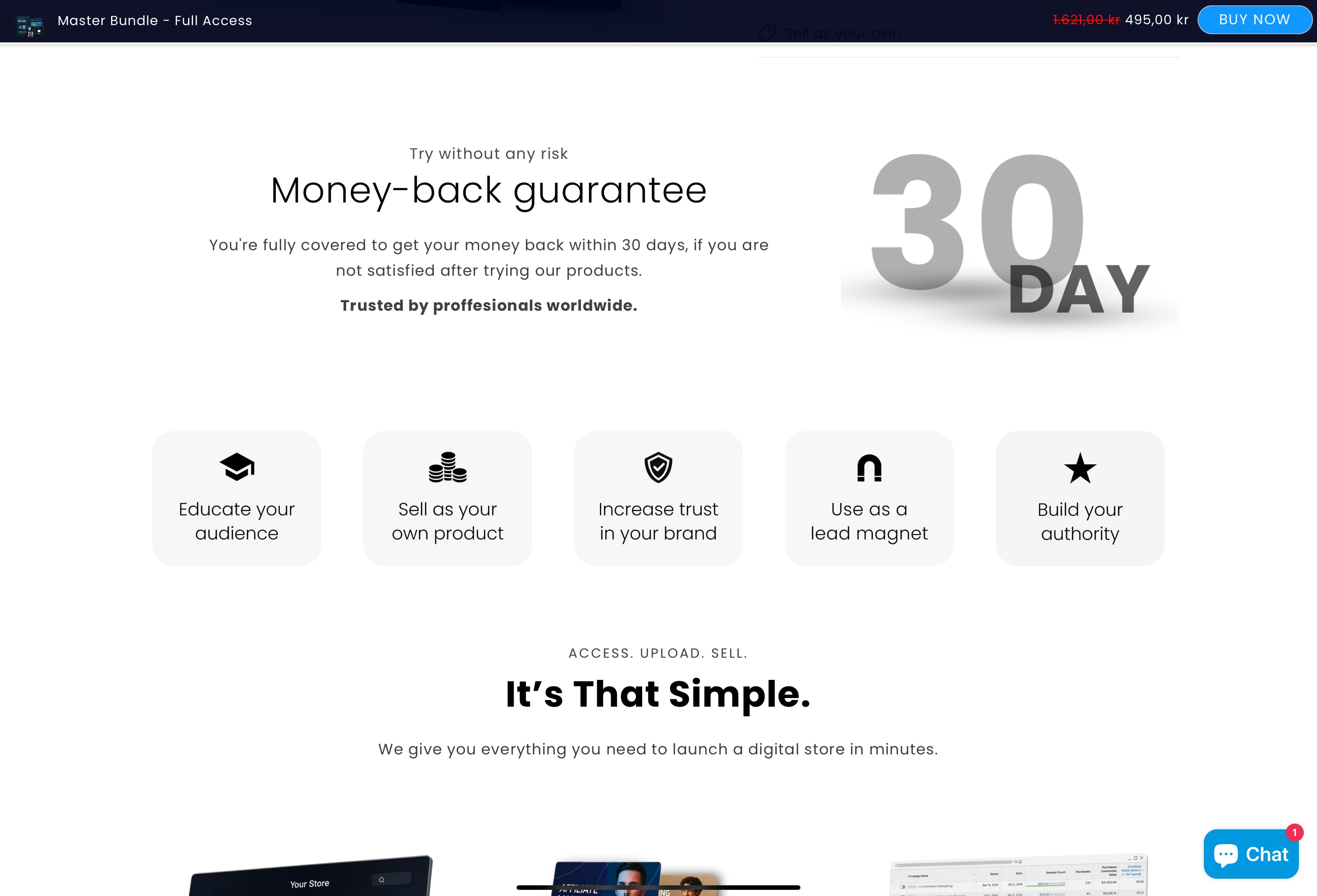 Her får du en flot og velfungerende webshop med digitale produkter inden for en lang række populære kategorier – alt fra e-bøger, kurser, billeder, videoer, templates, markedsføringsmateriale og meget mere. Kort sagt: én samlet platform, hvor kunderne købe alt det digitale indhold, de har brug for.