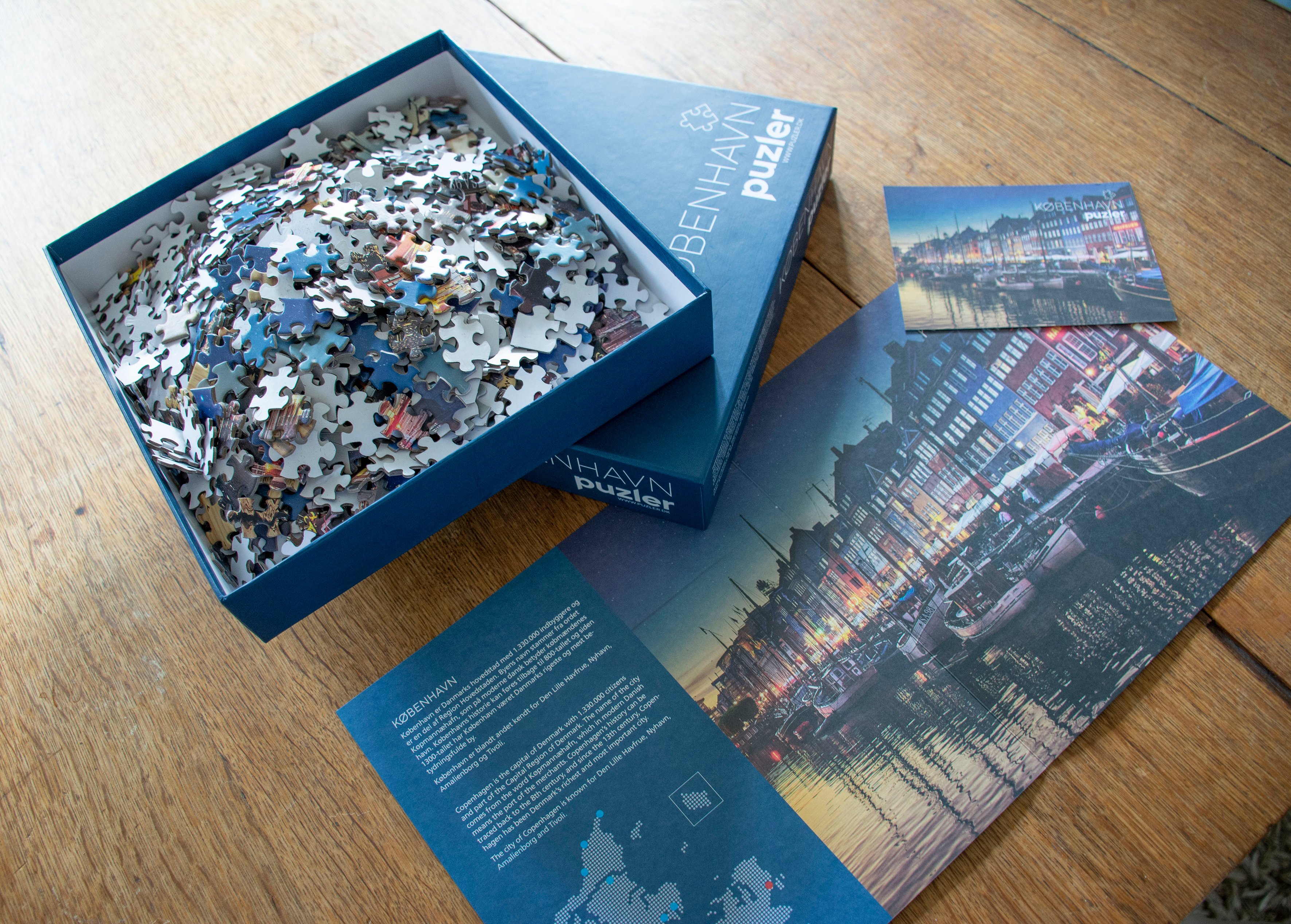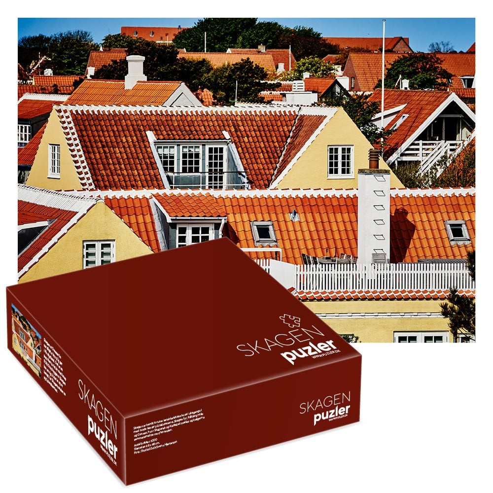 Vores puslespil er 1000 brikker, med flotte lokale by motiver. Der medfølger en folder med beskrivelse af byen og motiver til hver puslespil samt et postkort med motivet.
