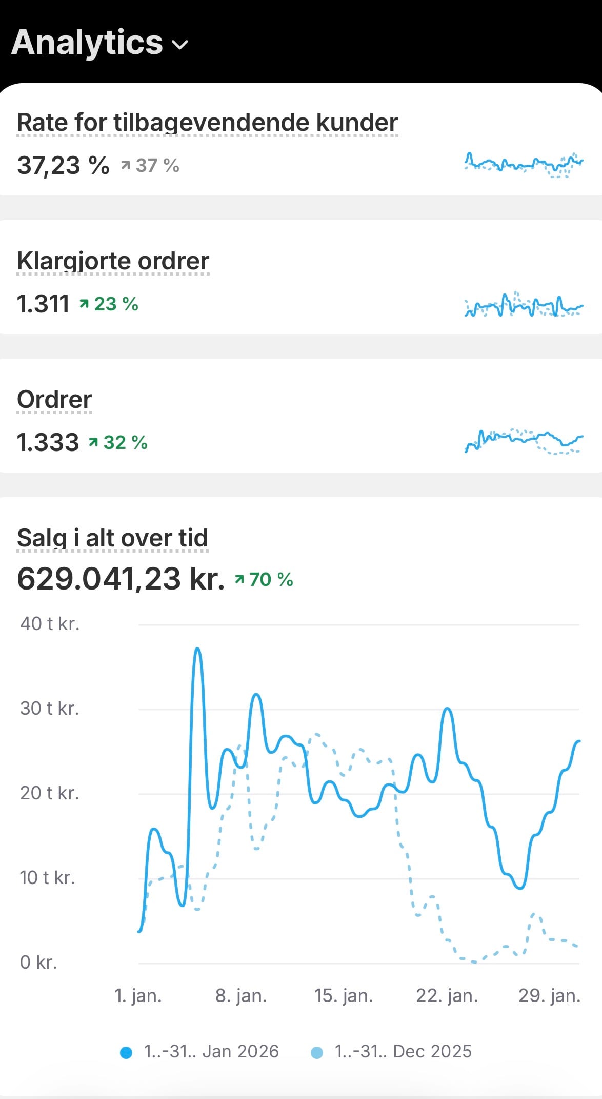 Alene i januar omsatte vi for 630.000 kr., svarende til en vækst på over 70%. Samtidig er vores bruttofortjeneste steget med 3,7% sammenlignet med januar 2025, hvilket understreger en markant forbedring i både vækst og indtjening.