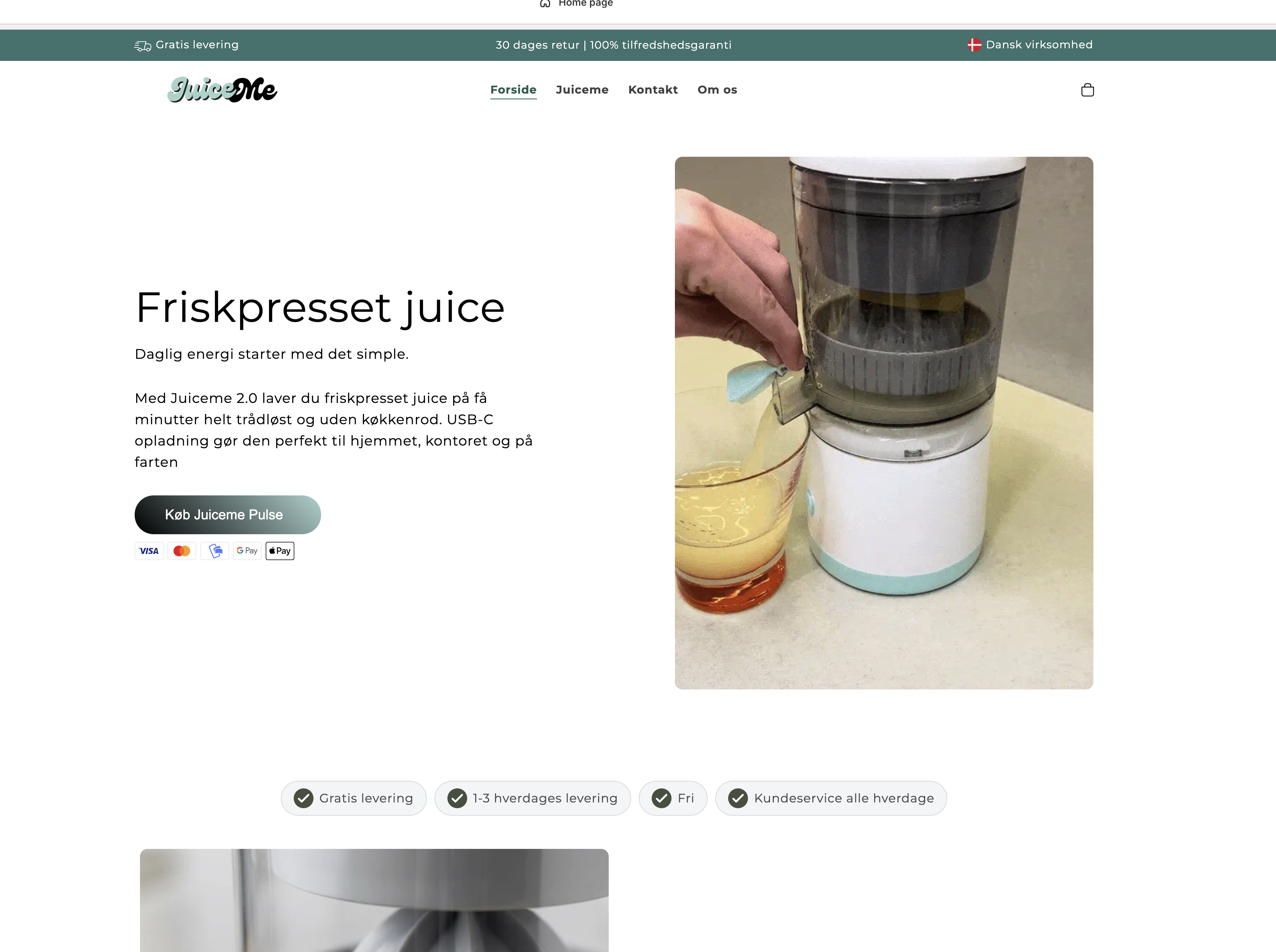 Webshoppen er bygget med fokus på konvertering: lækre produktsider, tydelig value proposition, troværdigt setup og en simpel kunderejse, så du kan gå i gang uden teknisk erfaring. Der har allerede været salg uden markedsføring, hvilket bekræfter at konceptet fungerer – nu handler det bare om at trykke på speederen med ads, influencers eller organisk contentJuiceme.dk sælger rene, ready-to-drink wellness-juicer med fokus på kvalitet og enkelhed. Produkterne er målrettet kunder, der vil have en nem løsning til en sundere hverdag – fx mere energi, bedre fordøjelse og et hurtigt, rent alternativ til sodavand og sukkerholdige drikke. Det rammer et voksende behov hos forbrugere, der gerne vil leve sundere uden at bruge tid på at juice selv.