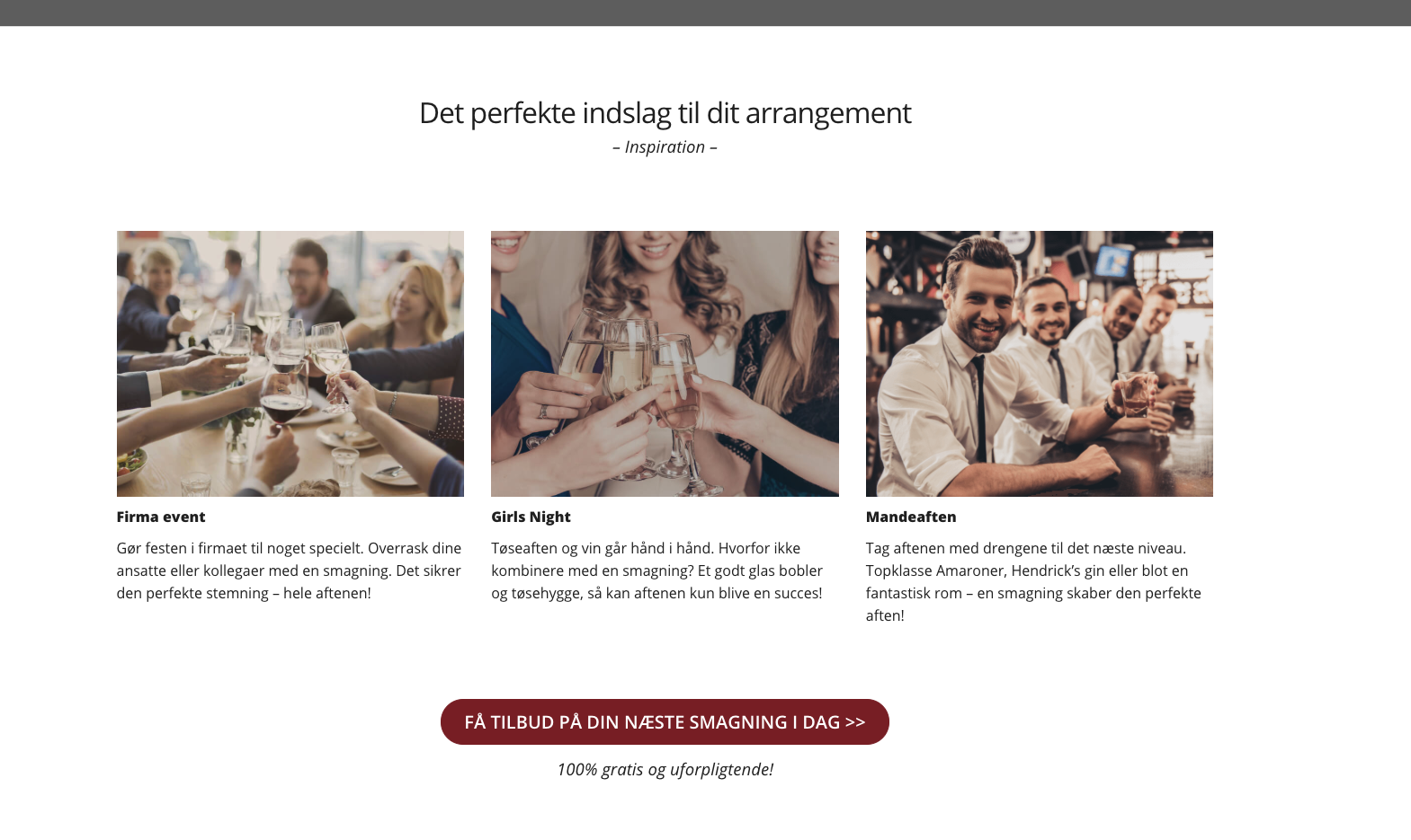 Det vores kunder godt kan lide er at de bestemmer hvordan hele pakken skal se ud. Tid, sted, tema, pris pr. person osv. Så er det op til smagningseksperten at efterkomme dette ved at byde ind med hvad de mener passer til netop denne smagning.