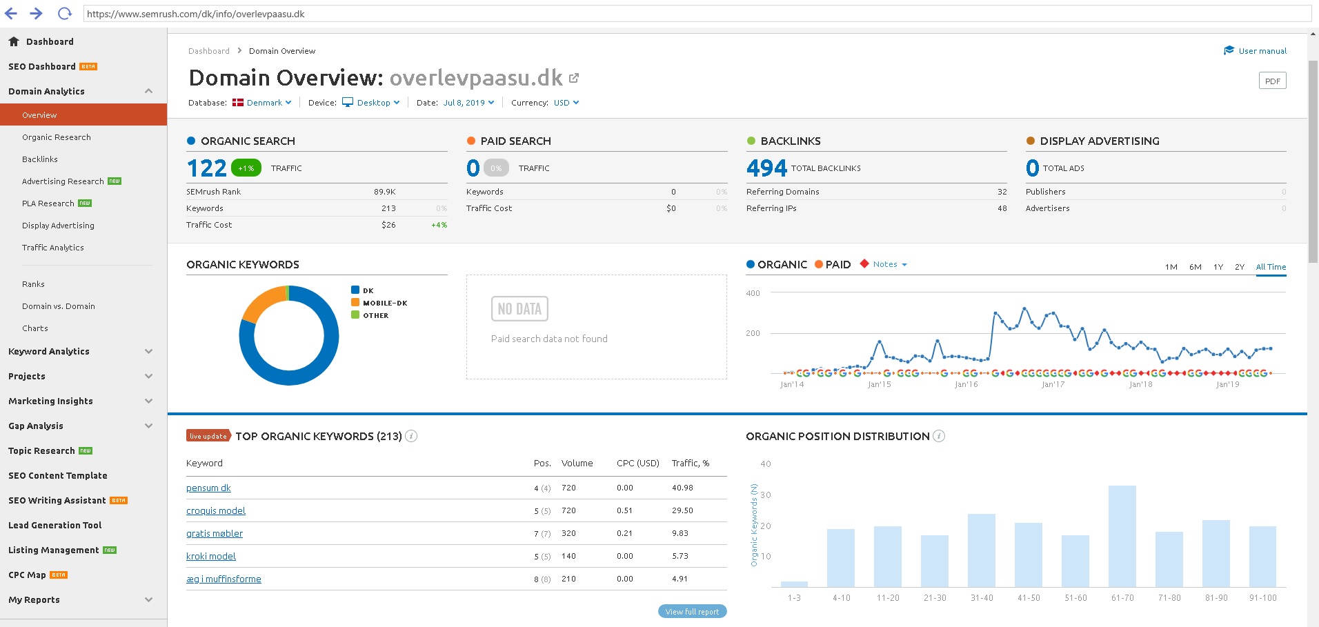 Vi har ikke arbejdet aktivt med websitet og Facebook gruppen de seneste par år, andet end få posts på Facebook. Websitet er derfor gået tilbage SEO-mæssigt, men med den rette indsat bør det være nemt at rette op på. Af samme grund har der heller ikke været indtjening på websitet ud over ganske få kroner på Google Adsense.
