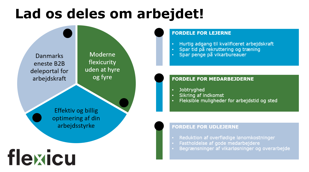 Flexicu er Danmarks eneste platform, hvor virksomheder kan dele deres fastansatte arbejdskraft med hinanden. Virksomhederne behøver ikke længere at hyre og fyre under høj- og lavsæsoner, men kan i stedet leje medarbejdere til og af hinanden.