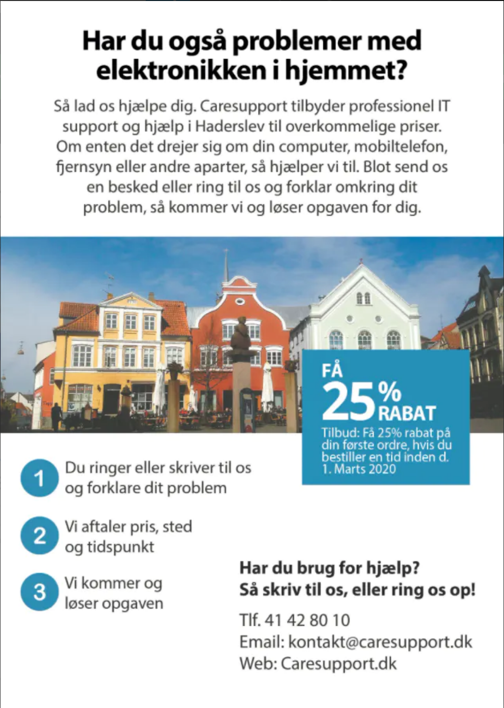 Virksomheden operer lige nu i Haderslev Kommune i Sydjylland. Jeg sørger for at ændre hjemmesiden samt flyers så de passer til den by du ønsker at yde IT support i. Med andre ord, skal du ikke røre en finger i etableringsprocessen!