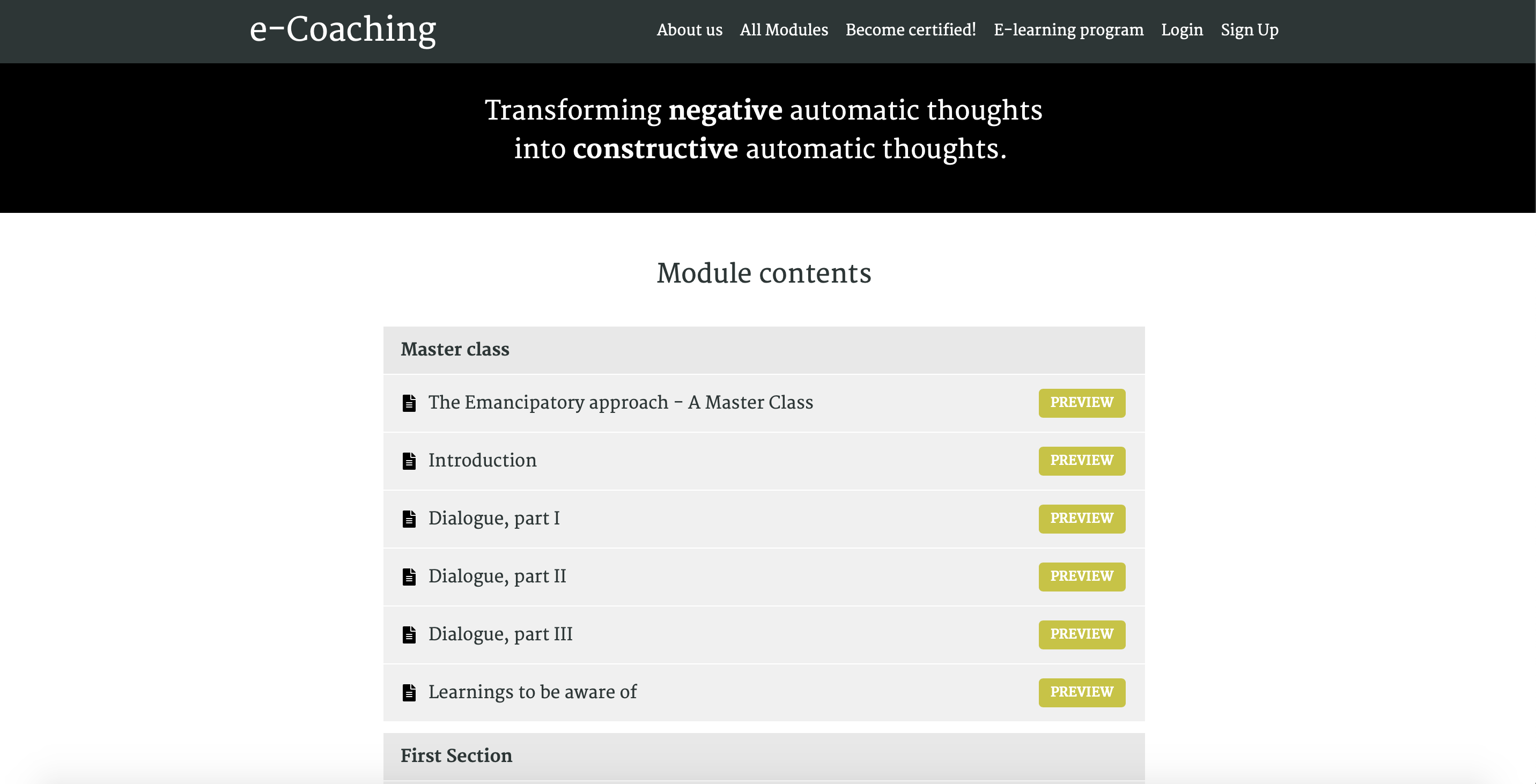www.e-coaching.dk er en læringsplatform udviklet til videreudvikling af coachingkompetencer. Det er et ’train the trainer-program’. Sitet er opdelt i fem moduler, hvor hvert modul giver dig en indføring i coachingdisciplinen med forskellige indfaldsvinkler. Derudover er der et dansk modul til karriererådgivere, hvor de kan finde inspiration til at rådgive jobsøgende med nogle nye tilgange. Sitet er udviklet både på dansk og på engelsk.