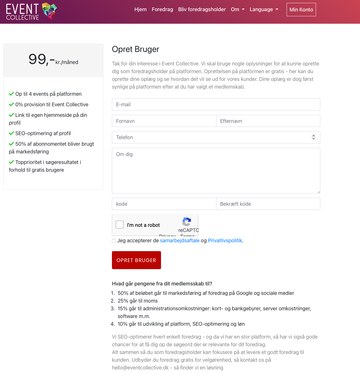 Platformen er pt. bygget til foredragsholdere, hvor der pt. er 350+ foredragsholdere og 250+ kunder. Kan udvides til musikere, catering og andre artister.