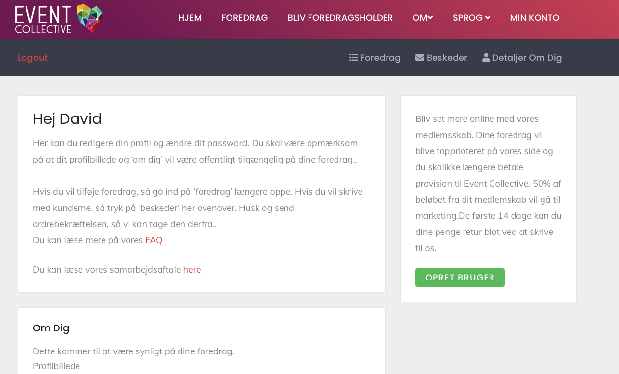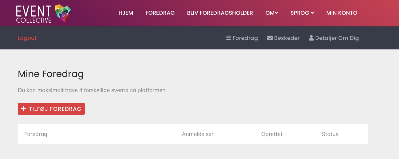 Event Collective er en bookingplatform, der gør det hurtigt og nemt at finde den ideelle foredragsholder til dit næste event. Vi har et bredt udvalg af spændende og inspirerende foredrag, workshops, oplæg og events i flere forskellige prisklasser. Via Event Collective kommer du i direkte kontakt med foredragsholderen - det er både gratis og uforpligtende. Sammen kan I aftale og skræddersy foredraget, så det matcher netop dit/din virksomheds behov.