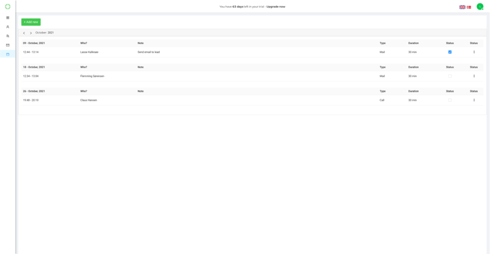 - Lead/kunde view, hvor man kan se tidlinje og lave ændringer på et lead.