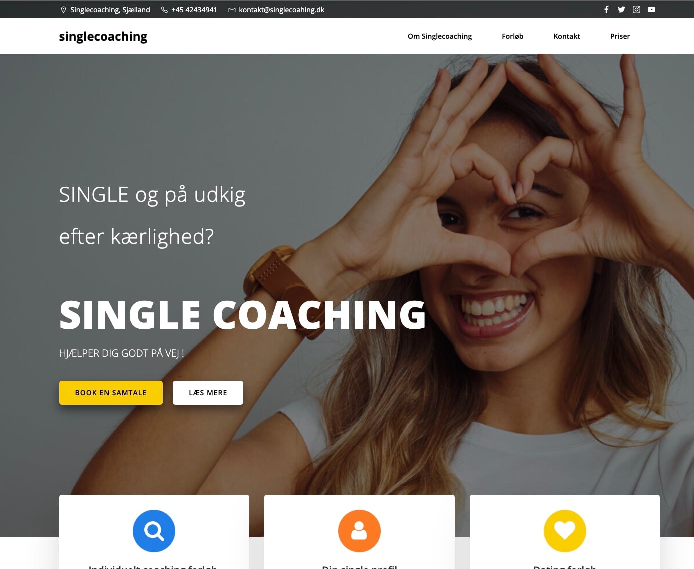 Her er en genial hjemmeside til salg - klar til at du kan gå igang med markedsføring og få kunderne i hus. SINGLECOACHING.DK er et nyt og anderledes koncept. Der er mange forskellige former for coaching og rådgivningsvirksomheder men SINGLECOACHING adskiller sig fra lignende konkurrenter da der her er udelukkende fokus på singler. Så hvis du er uddannet coach eller anden form for terapeut (du kan også tage en online coach uddannelse nemt og hurtigt) så er denne hjemmeside perfekt til dig der kunne tænkte dig at bygge en forretning op omkring singler. - nok en af de største målgrupper der findes i Danmark!