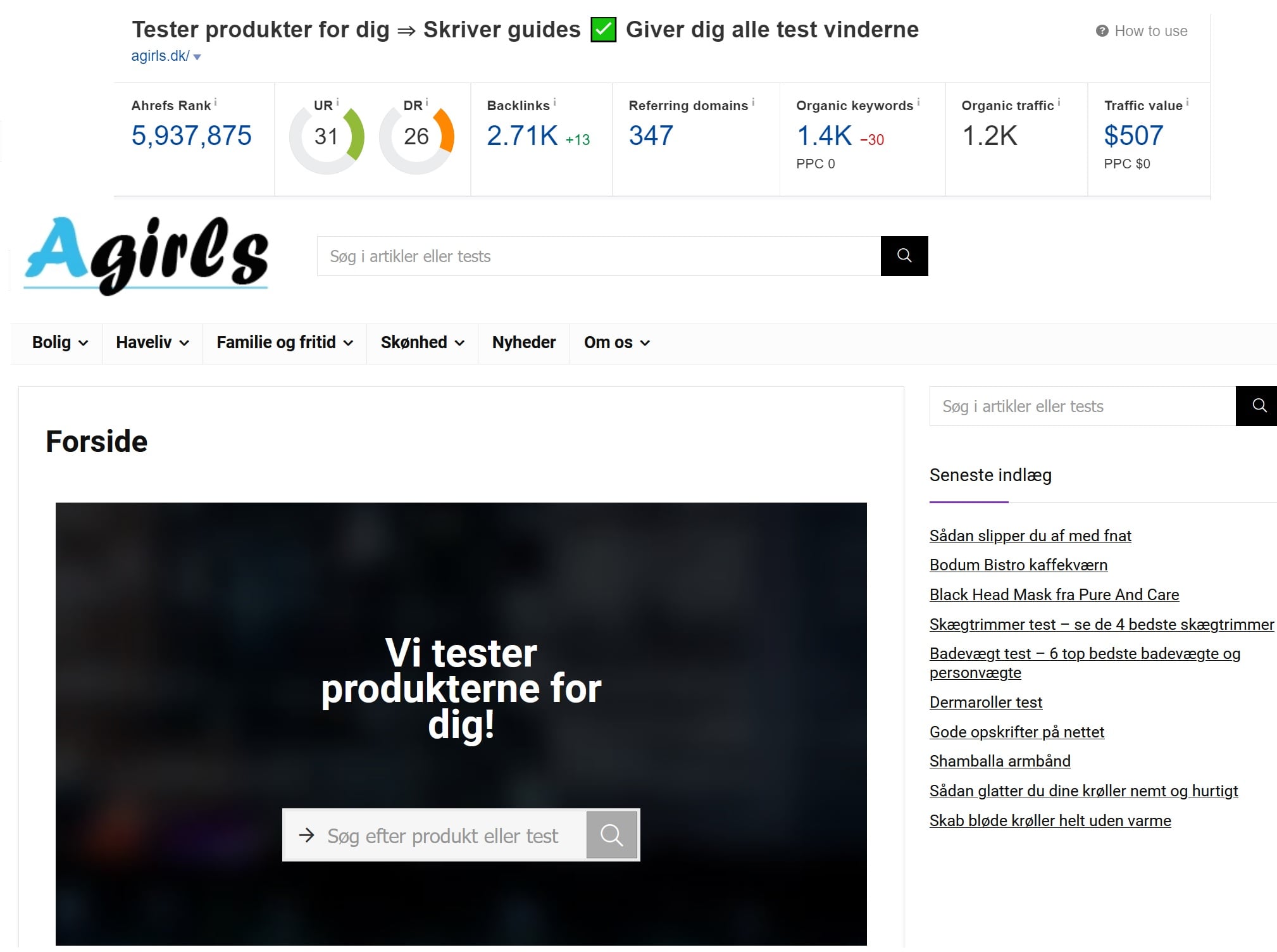 Websitet www.agirls.dk har fokus på test af forskellige produkter, og har så affiliate links til de forskellige produkter. Der er masser af besøgende. Man kan desuden begynde at sælge "sponsorede artikler" til firmaer - det kan man godt tjene fint på. Den har en stærk pagerank hos AHREFS, UR: 31 - DR: 26. Traffic value pr. måned er 507$. Siden har flere artikler som ligger på side 1 på google. Så der er masser af muligheder, men det kræver lidt knofedt og tid, så får du et website som er i top. Prisen på siden er taget ud fra hvad det cirka vil koste at skrive alle disse artikler.