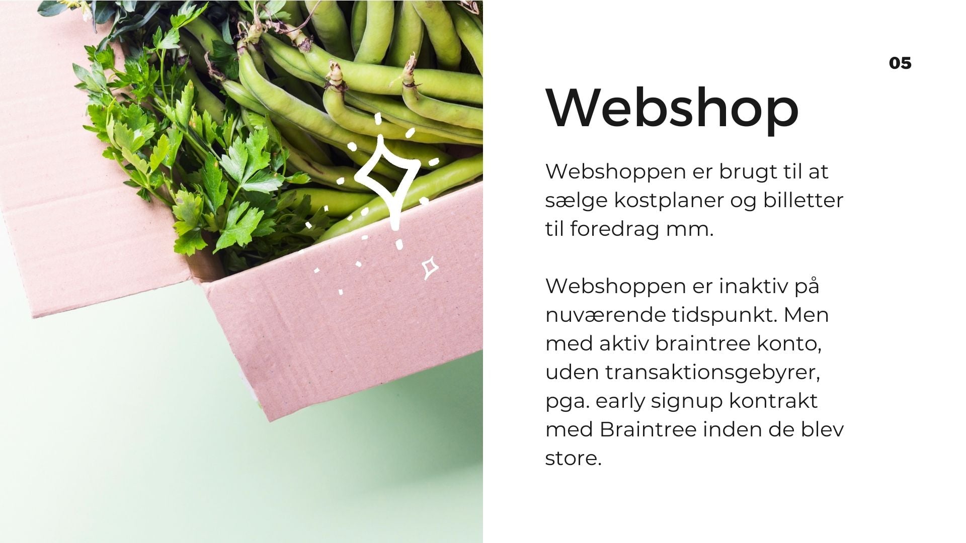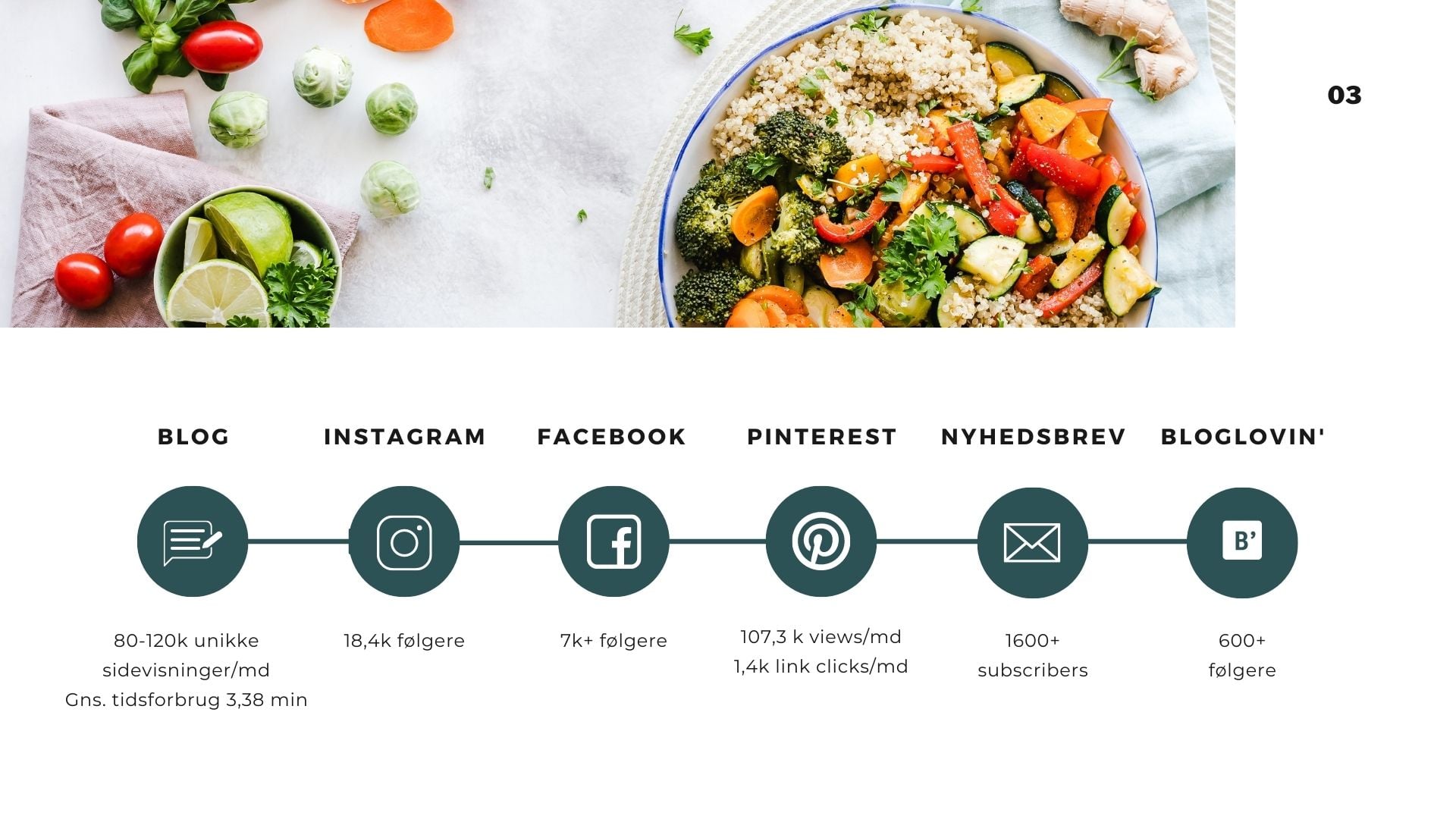 - En hjemmeside med mellem 40.000-120.000 unikke (organiske) besøgende per måned afhængig af sæson og SoMe aktivitet. Hjemmesiden indeholder over 1200 indlæg - en blanding af sunde opskrifter og artikler og blogindlæg om fødevarer, fysisk aktivitet, og stort og småt indenfor sundhedsparaplyen.