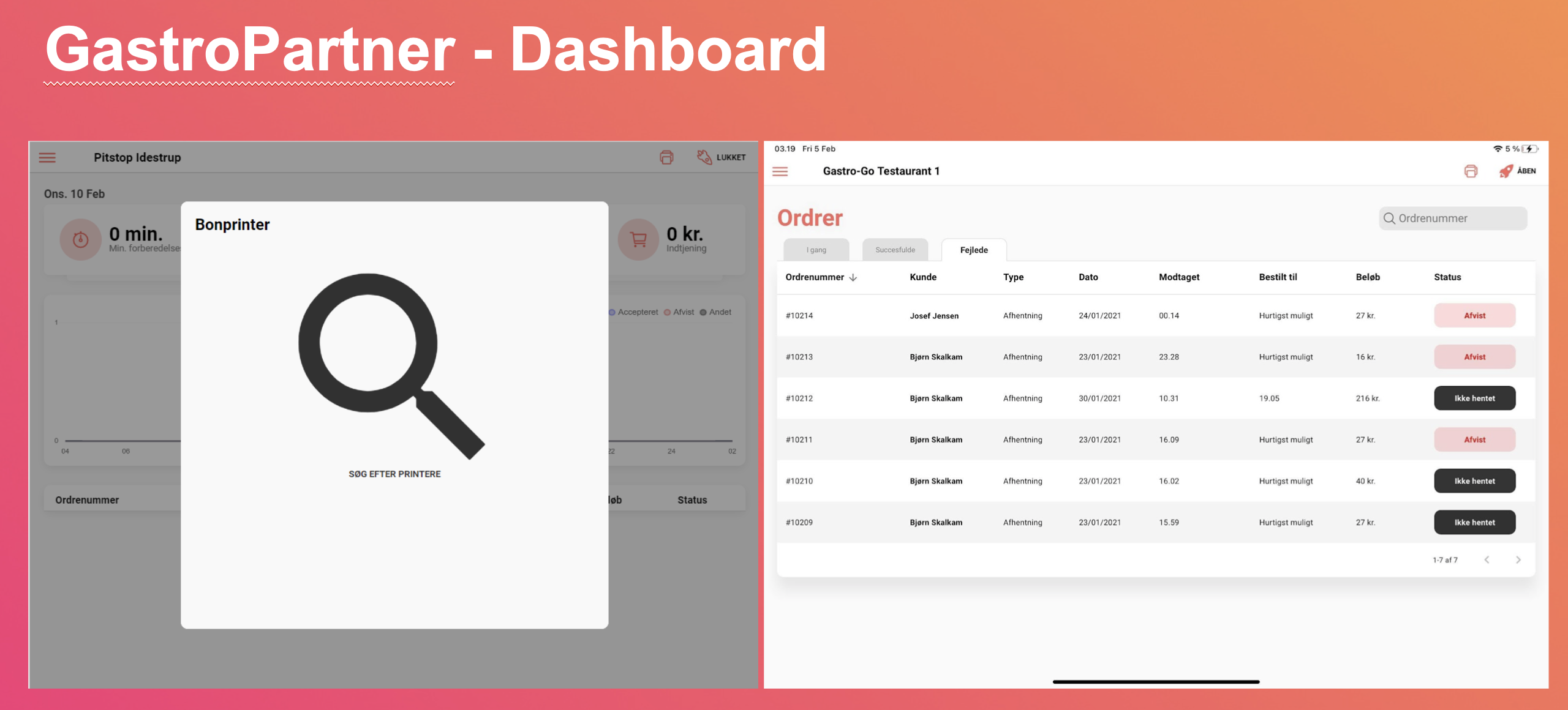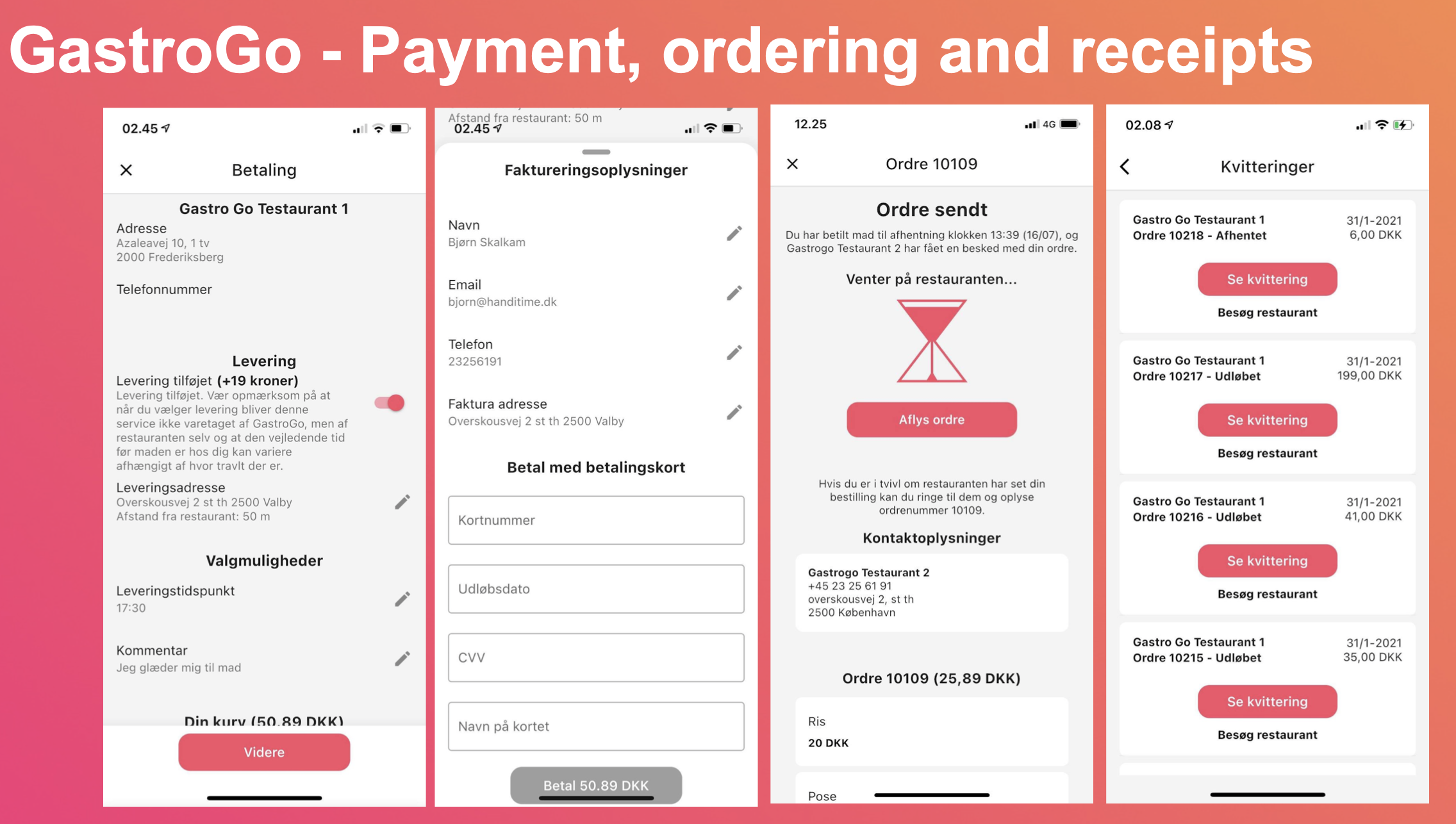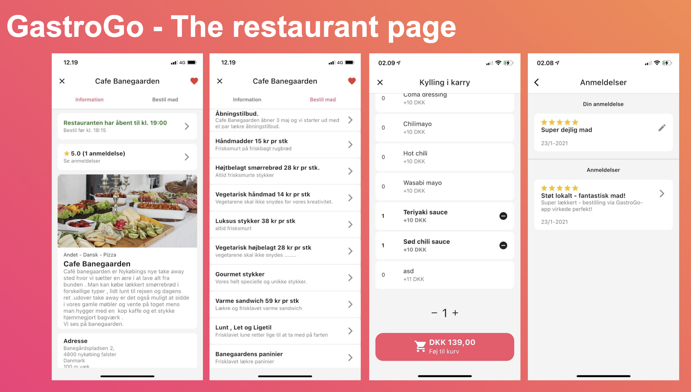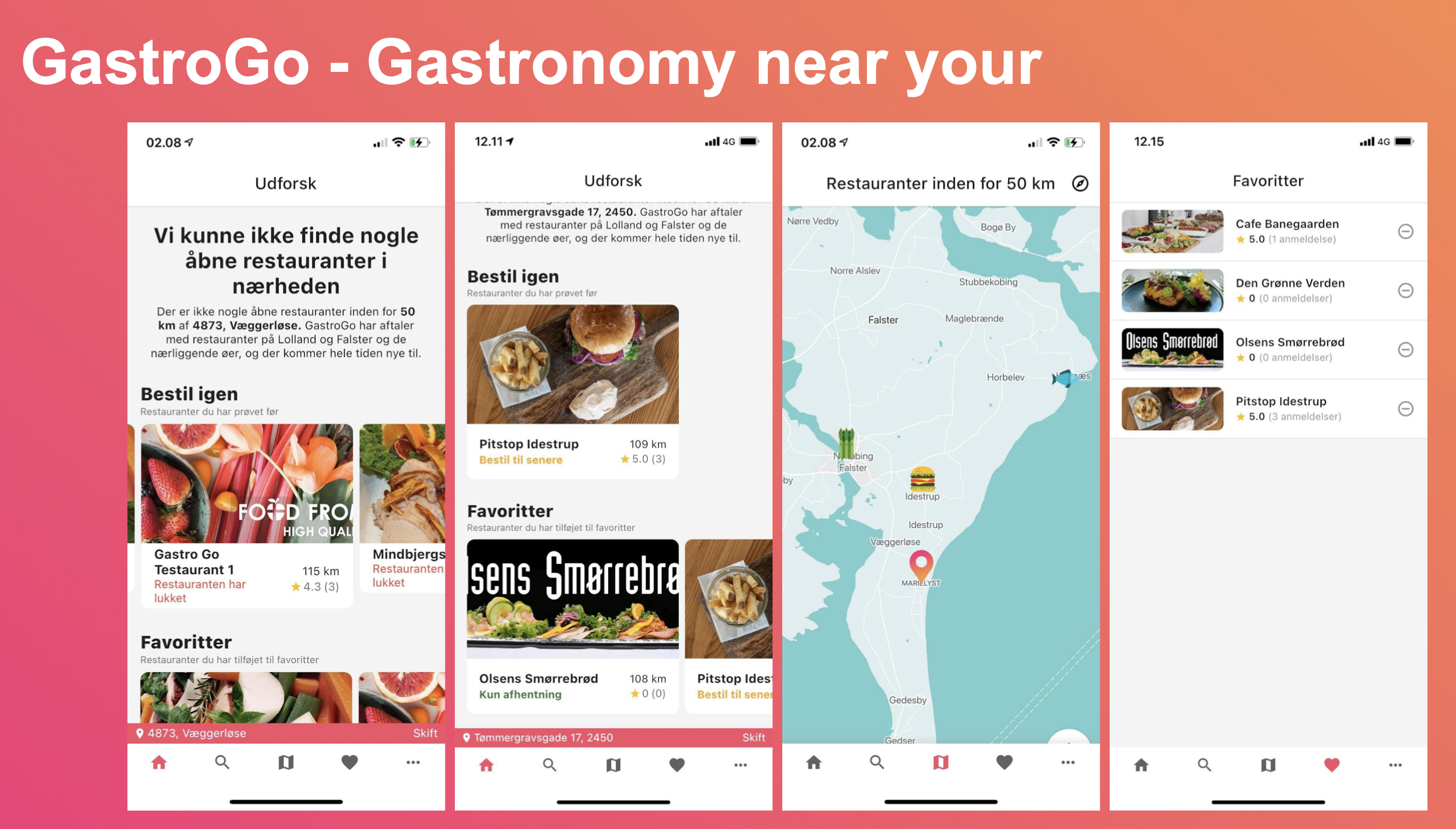 GastroGo er en madbestillingsplatform, hvor der er en kunde app til Android og iPhone som allerede ligger i app stores. Hertil er der en App til restauranten, hvor de kan tage i mod bestillinger samt se online bestillinger komme ind. Selve restaurant appen er lavet så dette er nemt for ejeren at rette, skifte eller tilføje nye produkter løbende.
