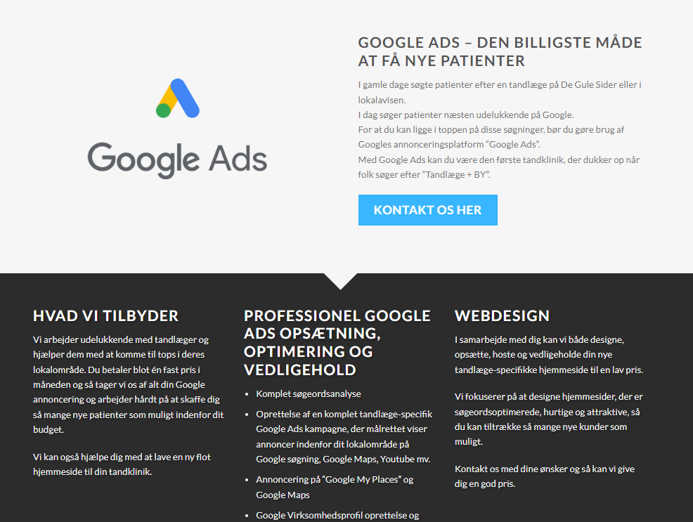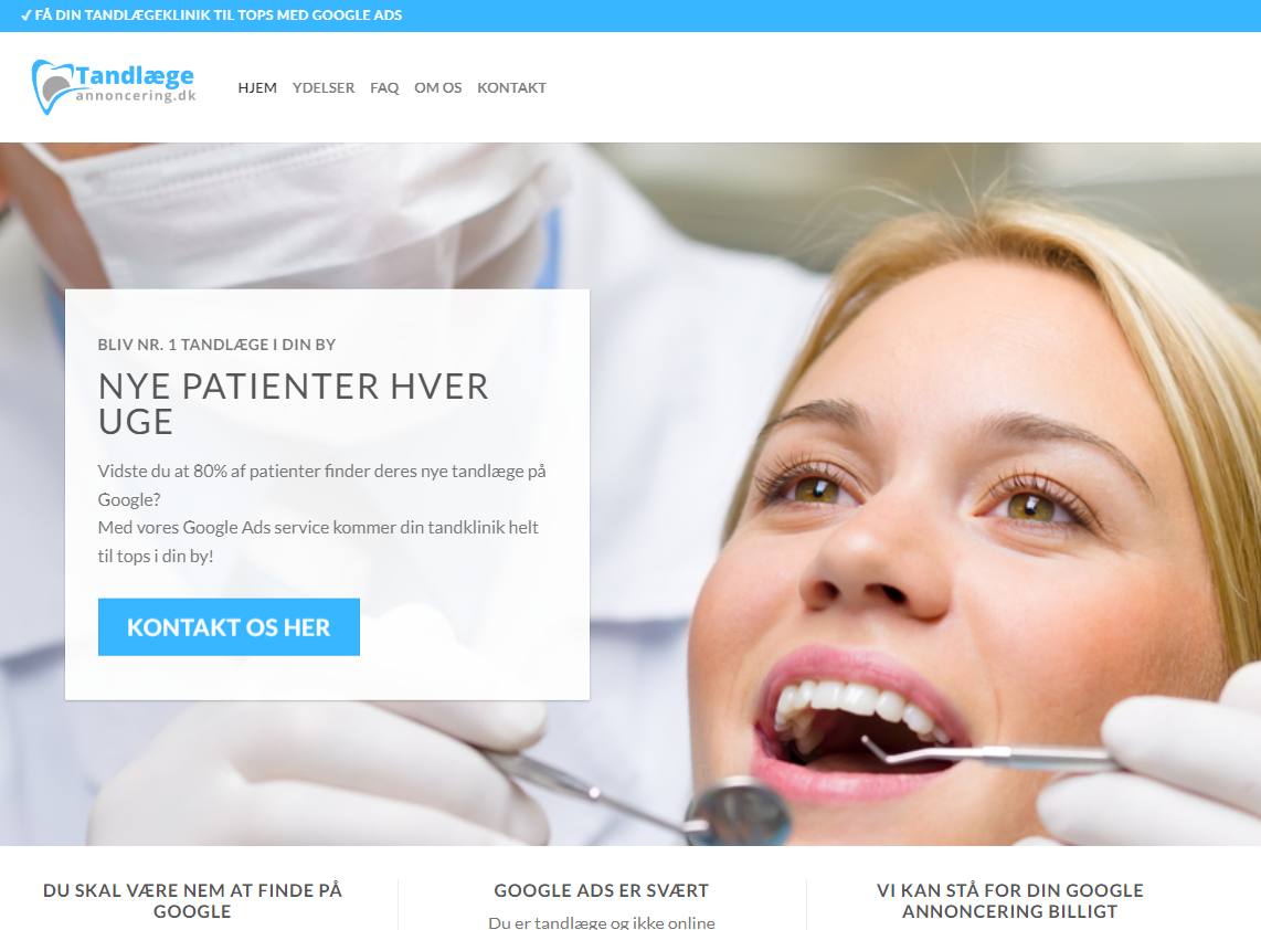Tandlægeannoncering.dk (tandlaegeannoncering.dk medfølger også) er den eneste hjemmeside og Google Ads reklamebureau der udelukkende henvender sig til tandlæger i Danmark.