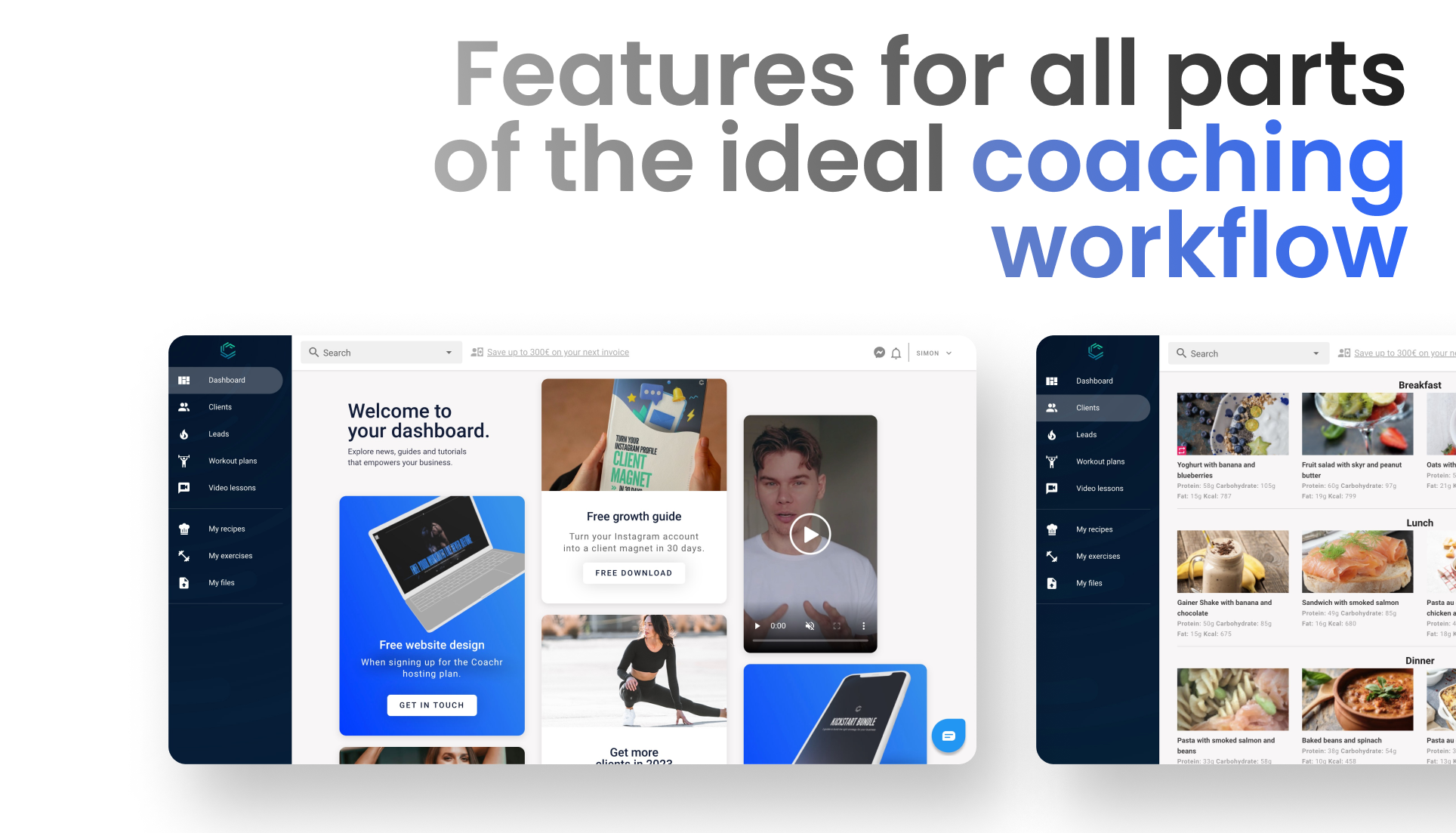 En software platform som samler mange af opgaver som personlige trænere, coaches og ernæringsspecialister foretager for at håndtere og servicere deres klienter, herunder udarbejdelse af kostplaner og træningsplaner, samt automatisering af progressionsmåling og klientopfølgninger. Alt materiale leveres direkte til klienten gennem vores dedikerede klientapp. Platform og app er tilgængelig på både dansk, svensk, engelsk, spansk og arabisk.