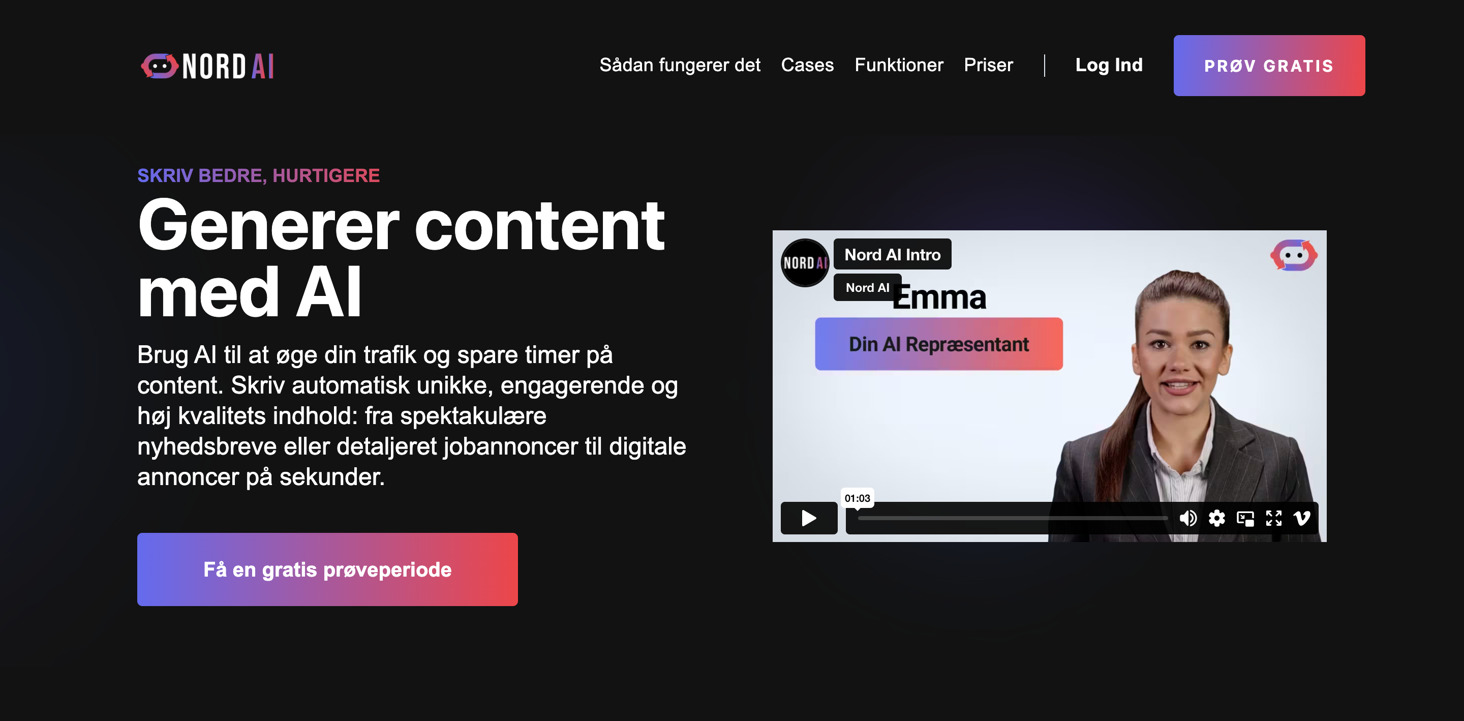 I alt er NordAI.dk en avanceret AI-drevet platform, der gør det nemt og effektivt at skabe kvalitetsindhold. Med dens avancerede funktioner og brugervenlige grænseflade kan brugere oprette originale og engagerende indhold på få sekunder, hvilket kan hjælpe med at forbedre deres online tilstedeværelse og øge trafikken og salget.