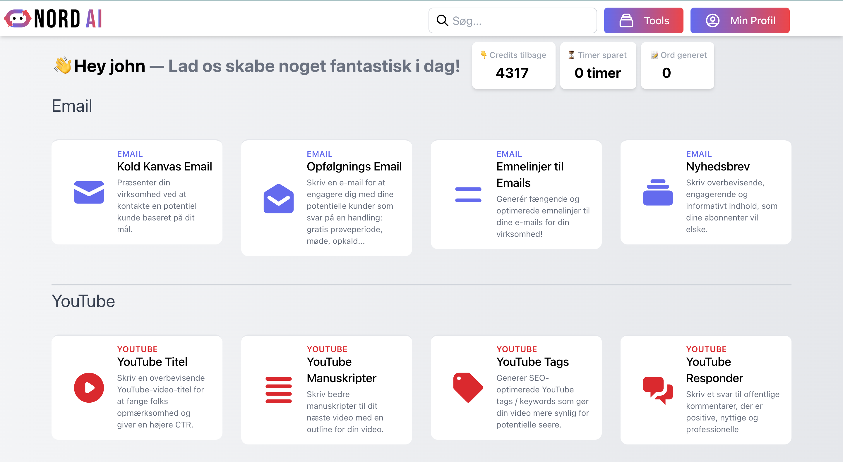NordAI laver 100% dansk baseret og kan skabe indhold ved bare at skrive minimum 2 ord(et emne og tonen som teksten skal være i). Der er lige nu +20 værktøjer/tools på platformen.