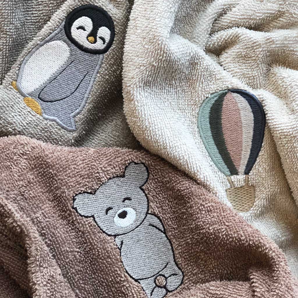 Sengetøj, opbevaring tasker, hagesmække, håndklæder, morgenkåber, ponchoer, bideringe, legetøj, nusseklude, bamser, badetøj, tallerkner, kopper, skåle, skeer, puslespil, osv.