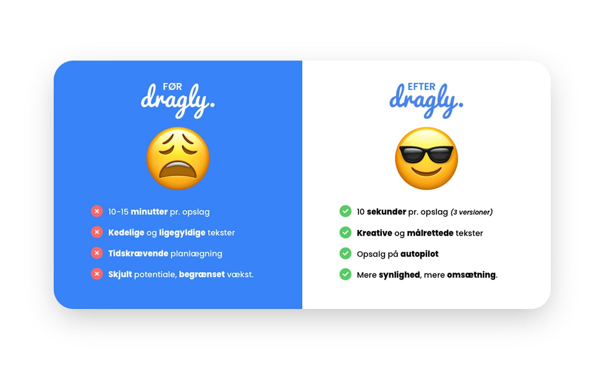 Så nu kan virksomhedsejere, brand, bureauer mv. slippe hovedpinen og lade Dragly være deres personlige SoMe konsulent og bruge 10 sekunder dagligt, i stedet for 20min!